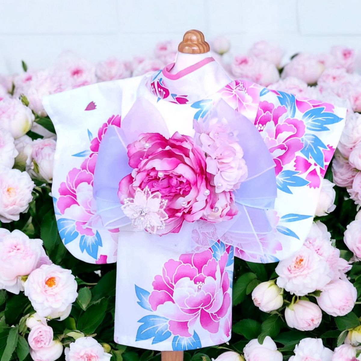 犬服の着物花結びホワイト(帯電防止加工裏地つき)ペットの着物