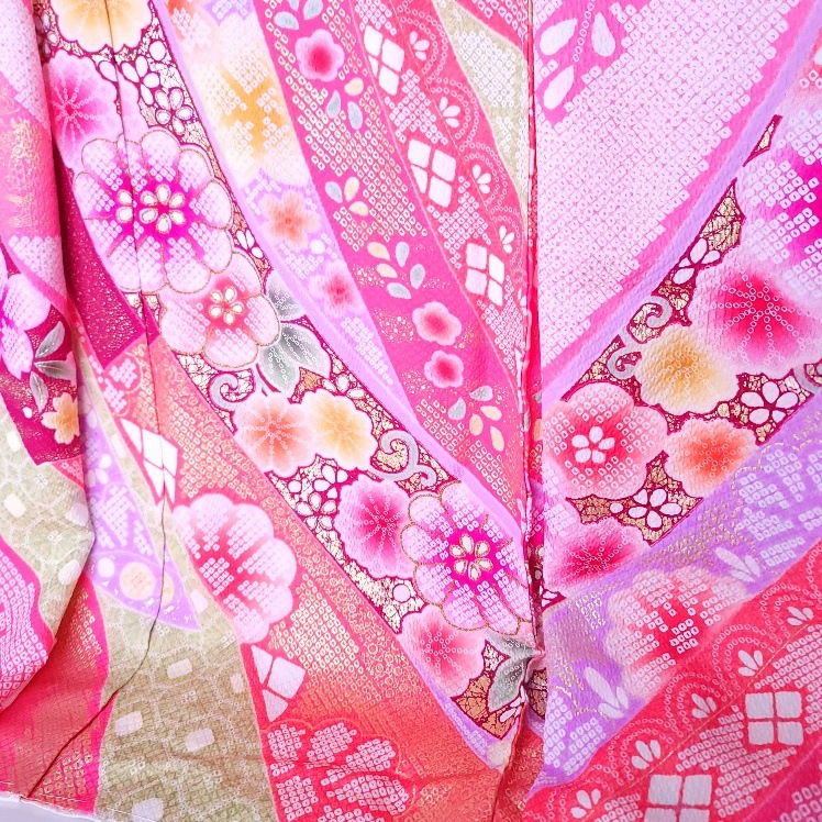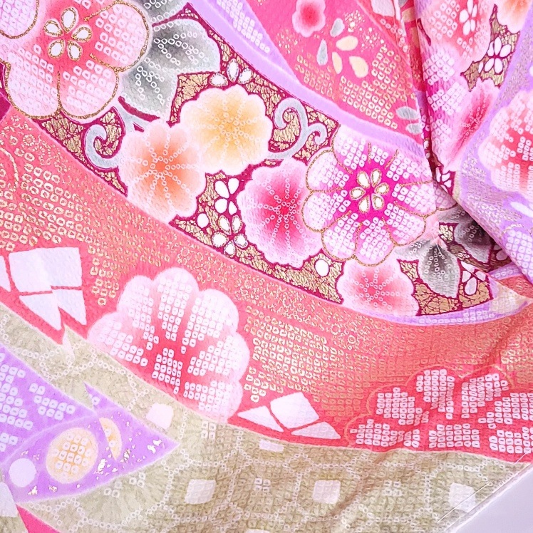 総絞り模様に熨斗目と美しい花々がたくさん咲いたお祝いにふさわしい1着。