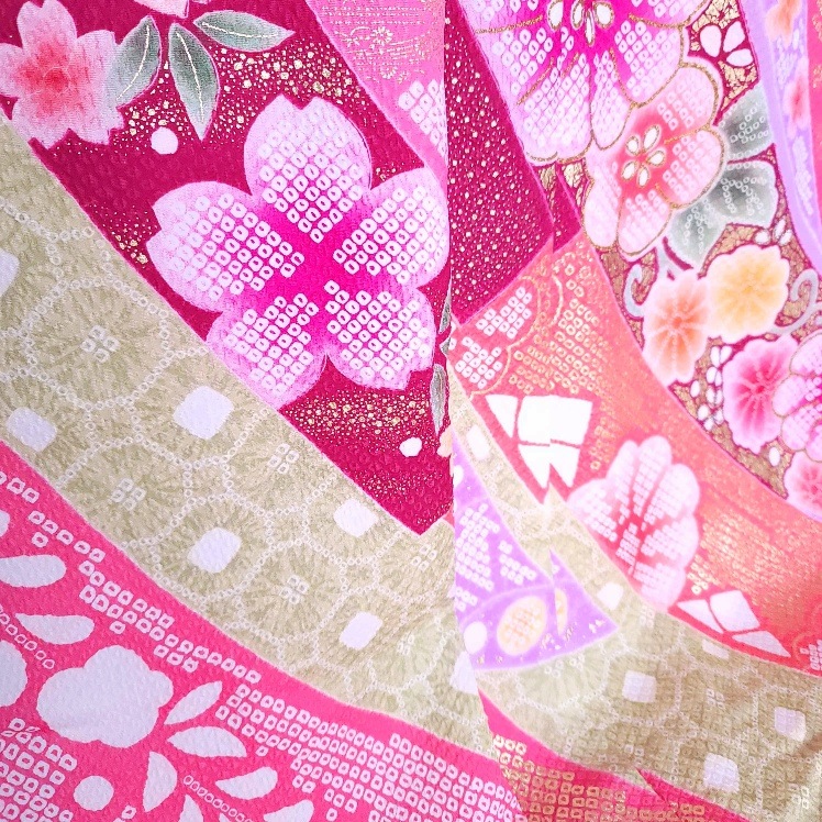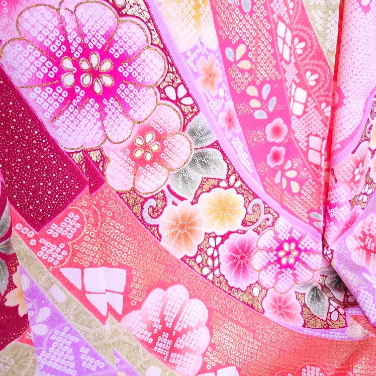 この熨斗が何本も束ねられた柄で、多くの人から祝福を受けていることと、その幸せを周囲にも分け合うという意味が込められた着物。