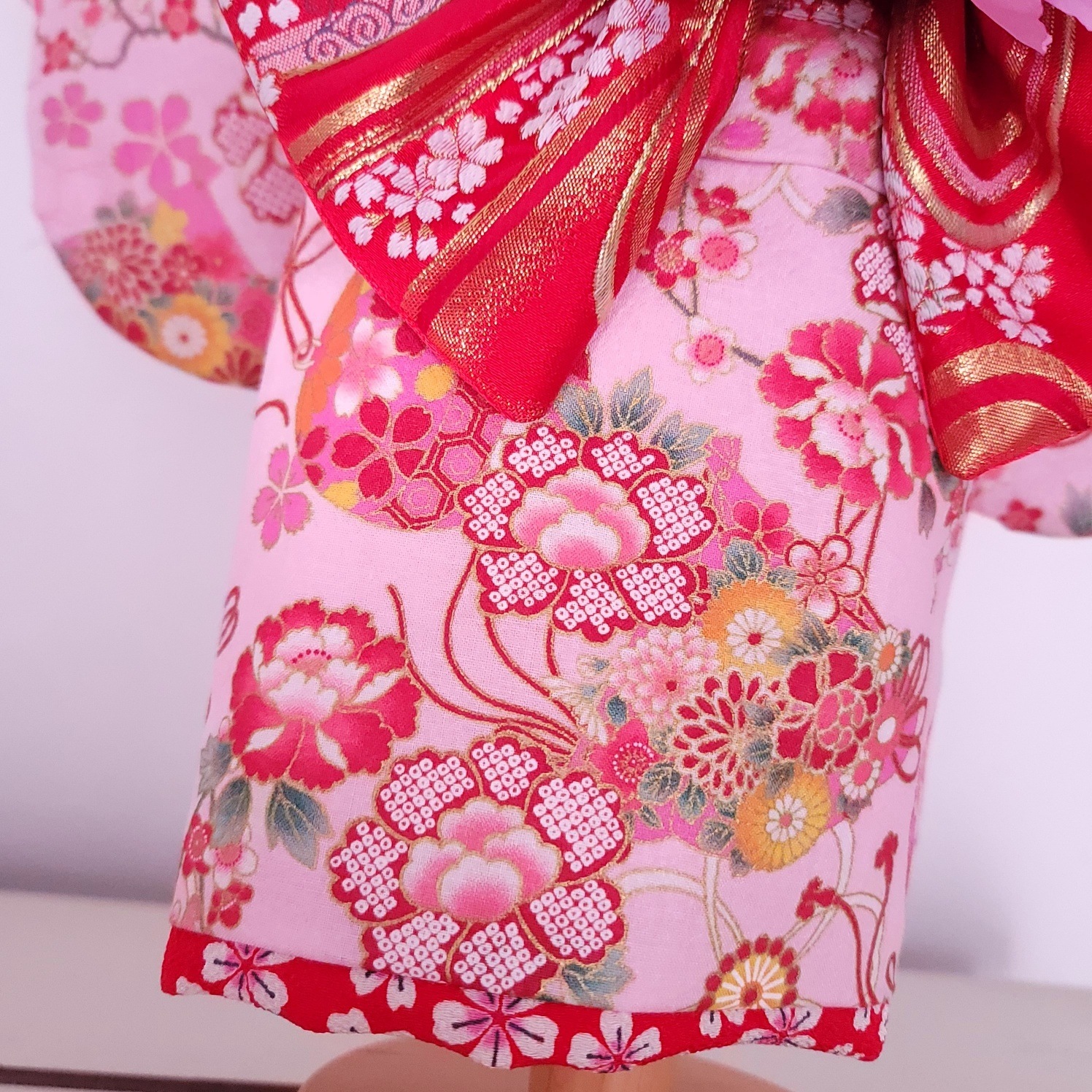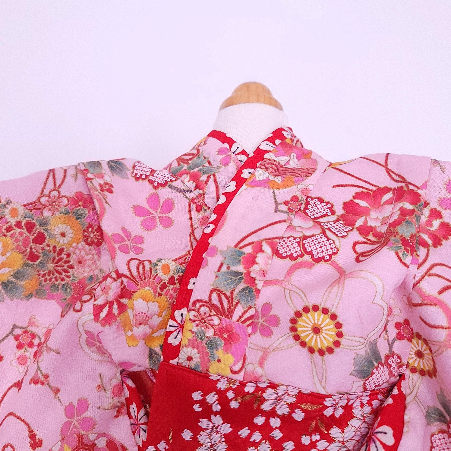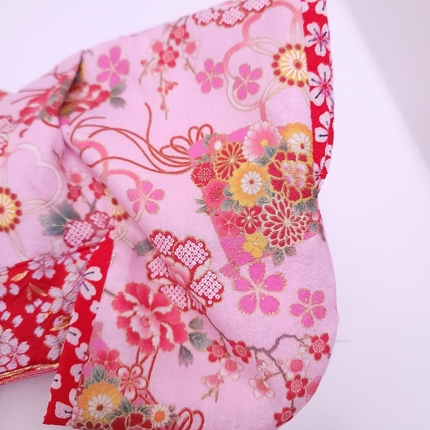 伝統的な和柄を基調とし、鮮やかな花々が描かれたデザインは上品さと可愛らしさを兼ね備えています。