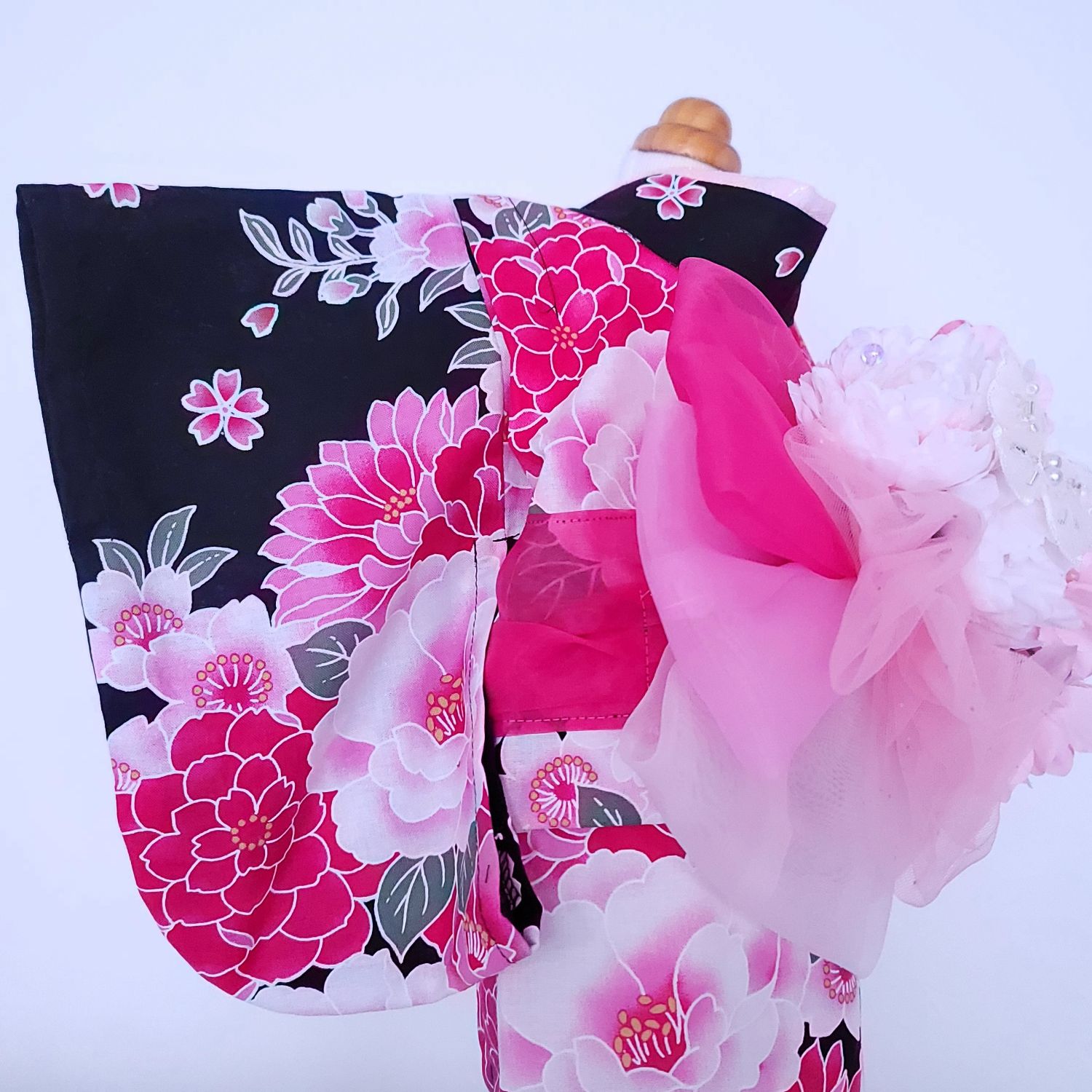 深みのある黒地に咲き誇るのは、華やかな紅白の牡丹と桜。
