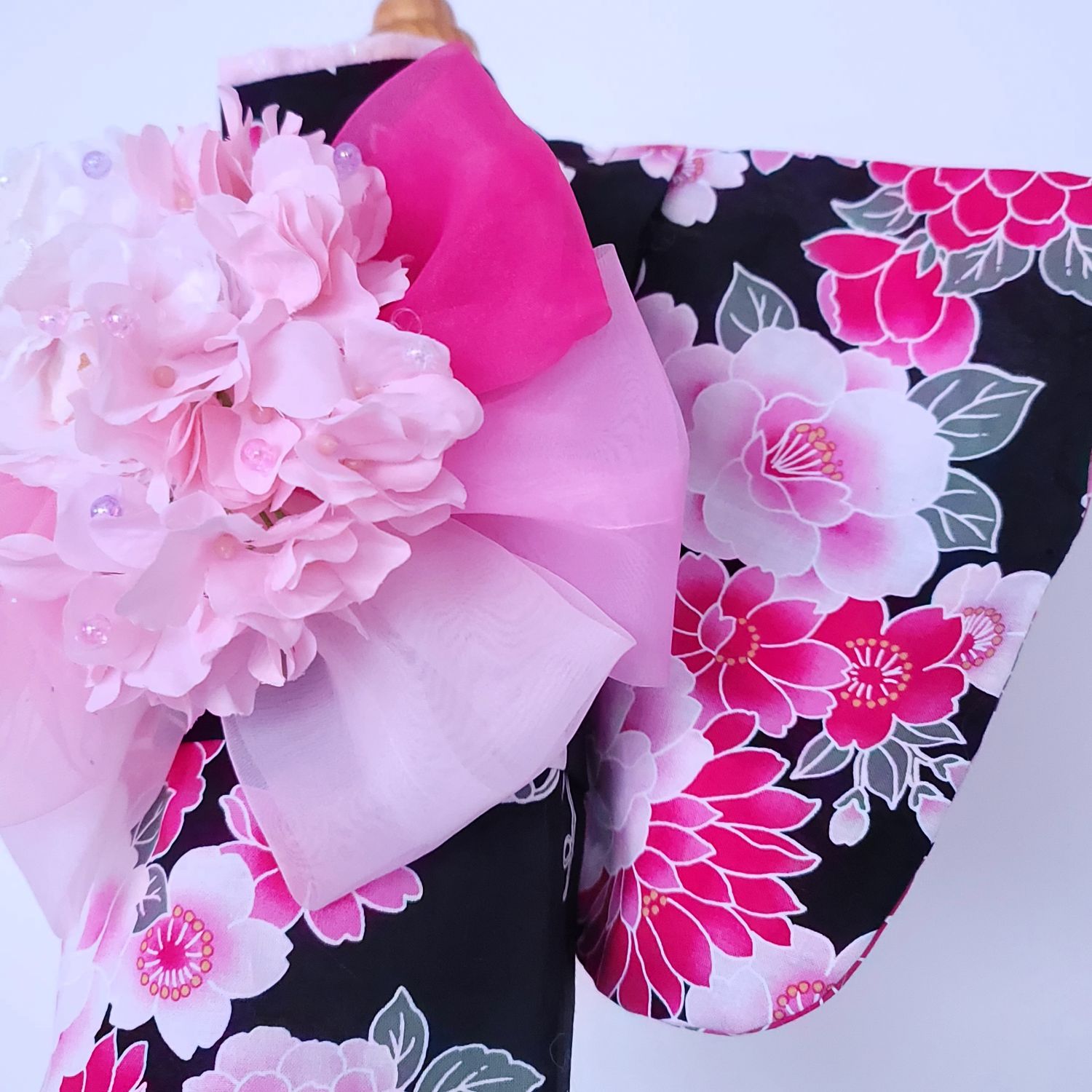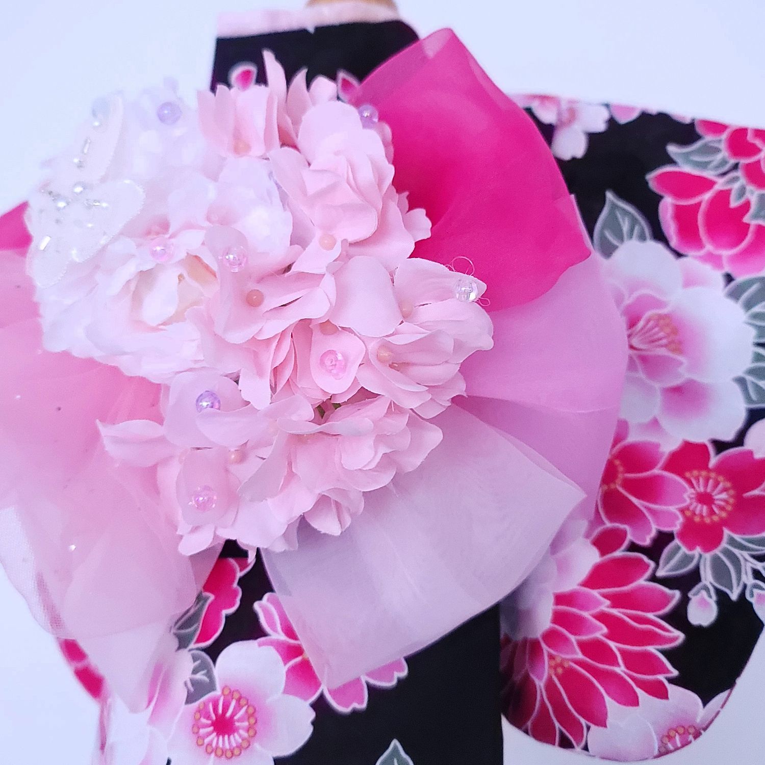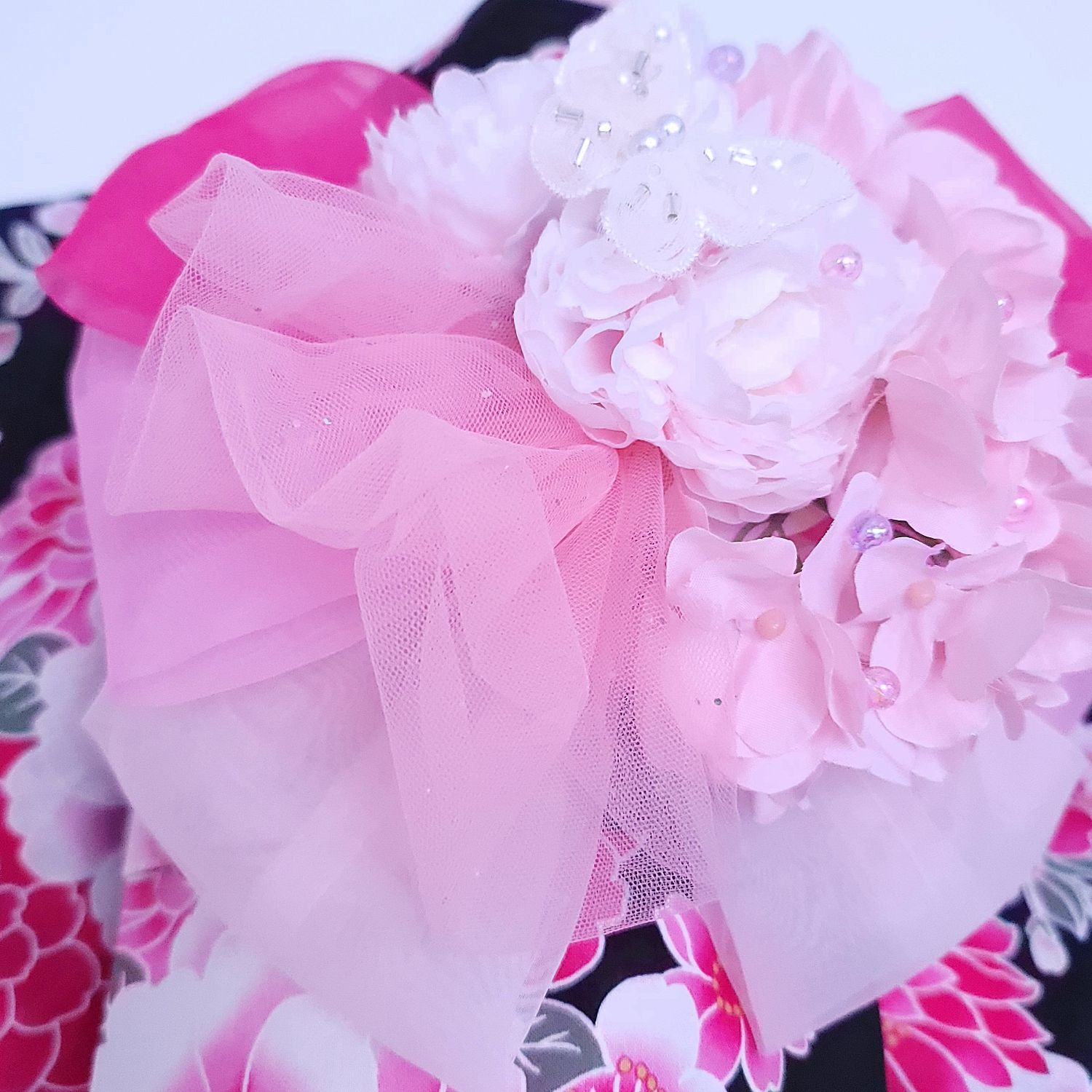 花飾りは、夜露をまとった牡丹のように気品ある輝きを放ちます。