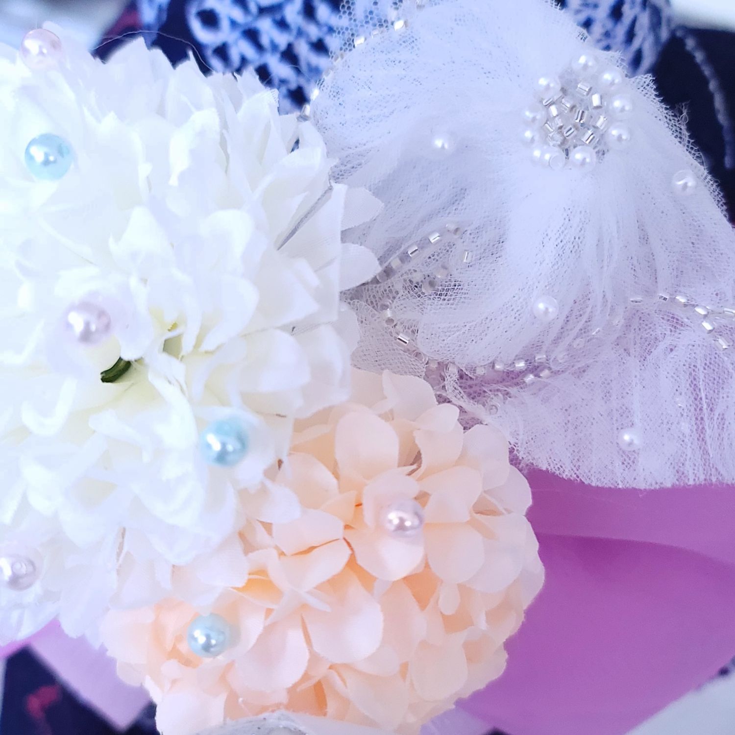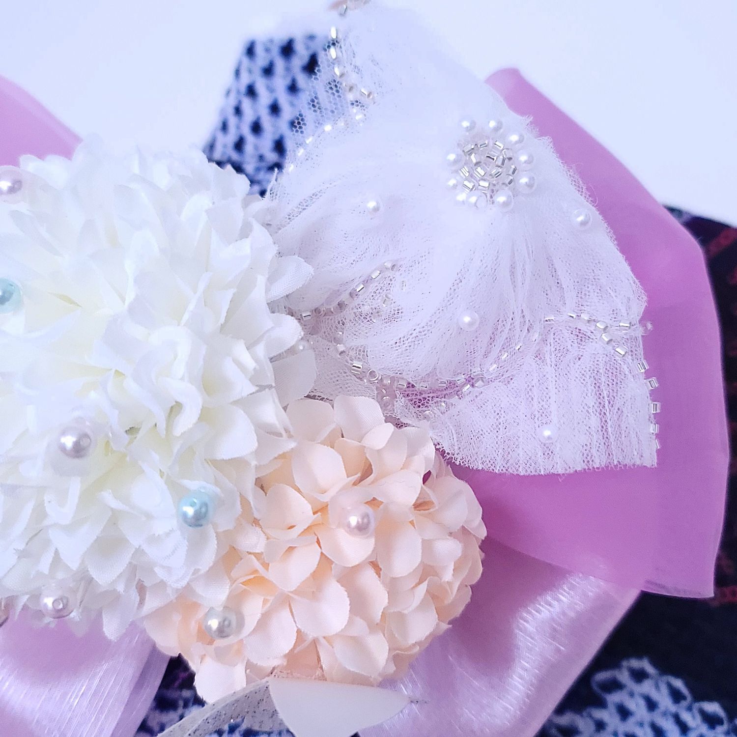 純白の花飾りは、夜露に濡れた月下の華を思わせ、
