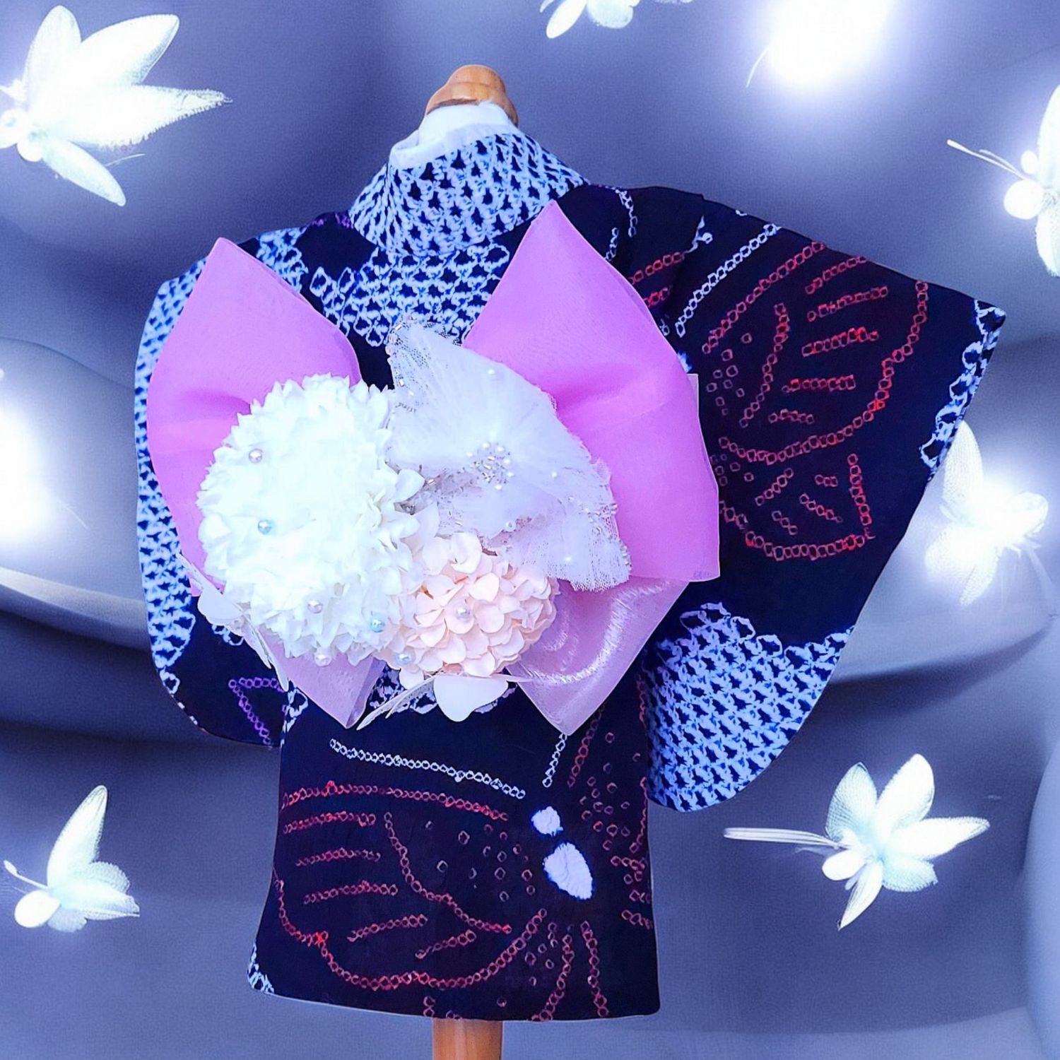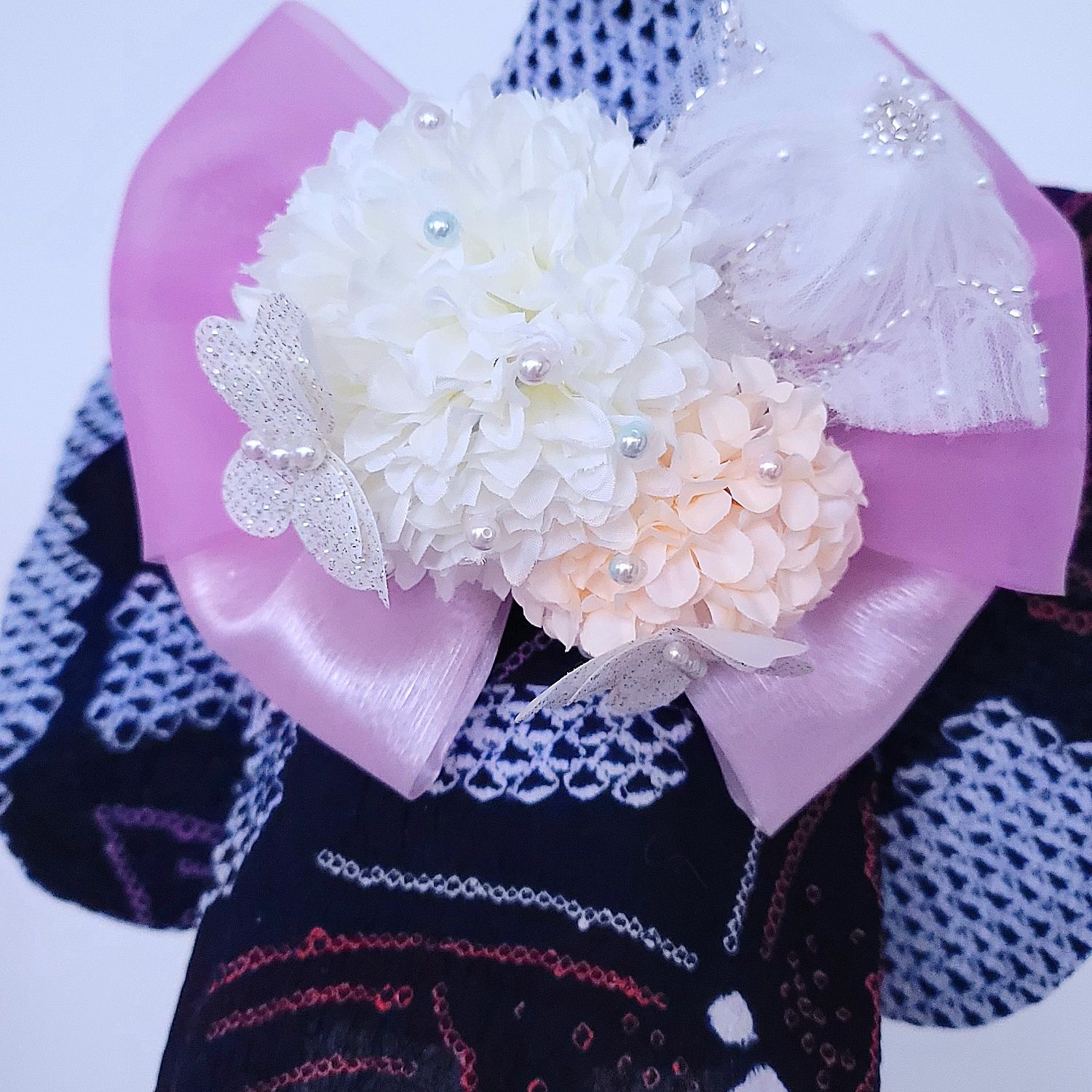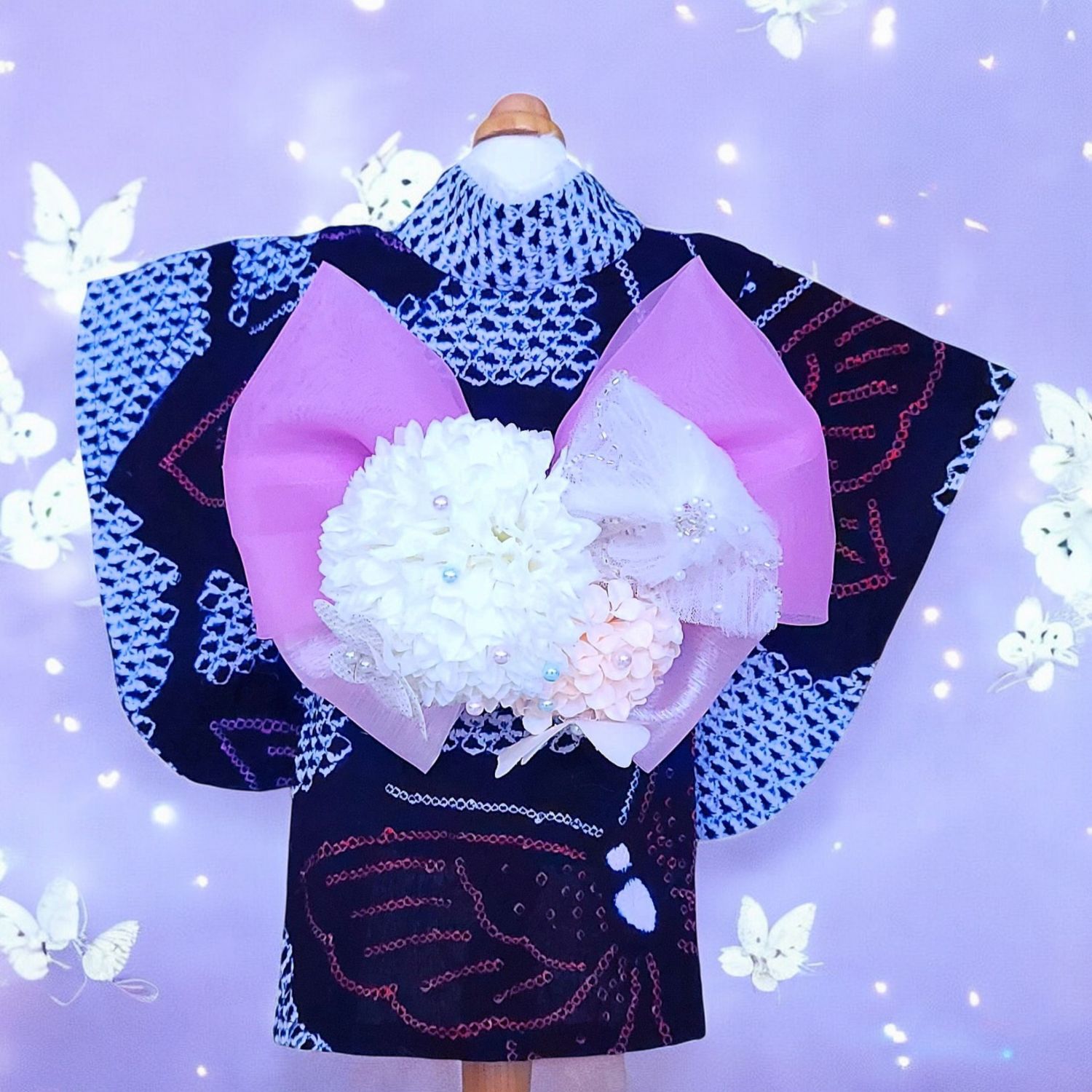 淡いピンクと紫のリボンが、蝶の羽ばたきを優しく彩ります。