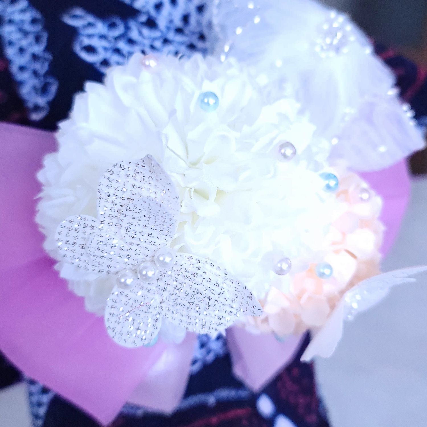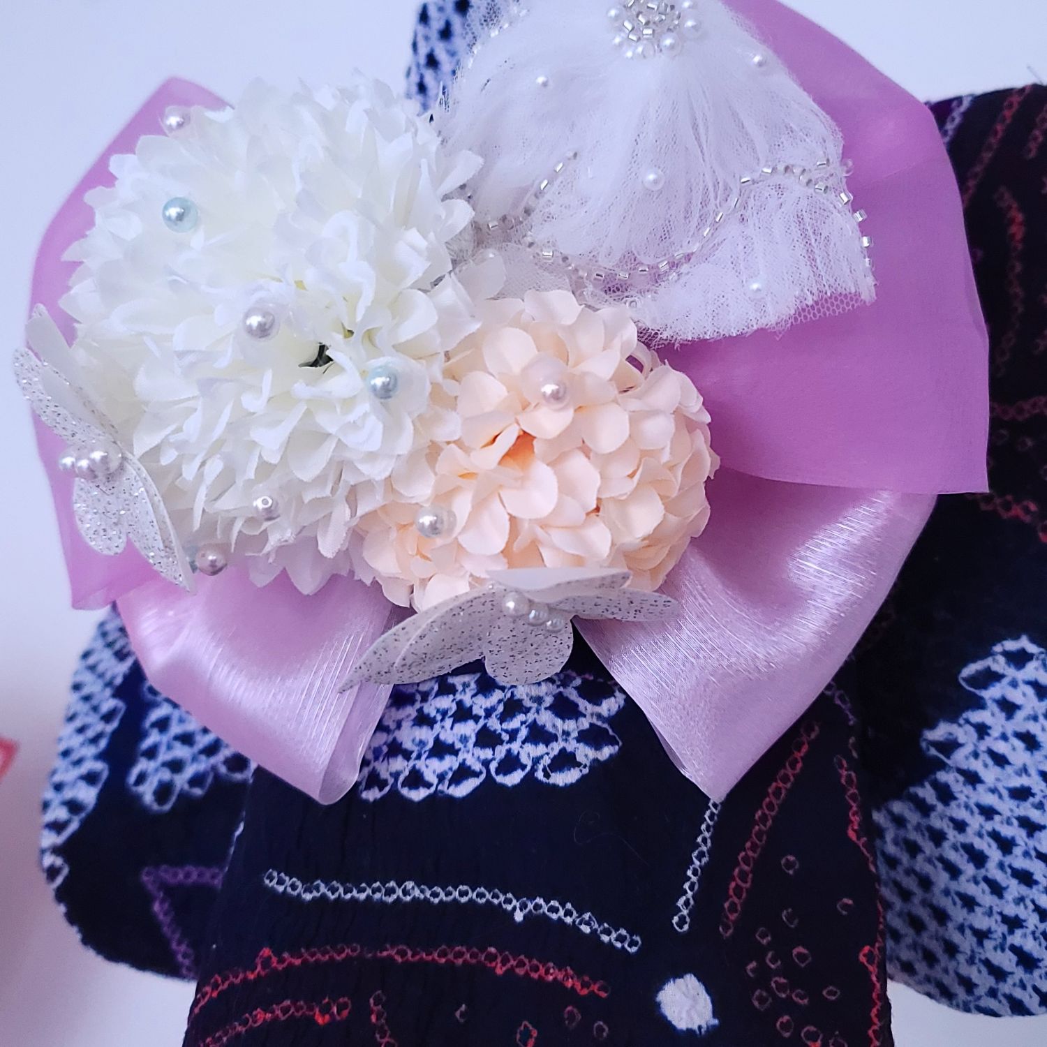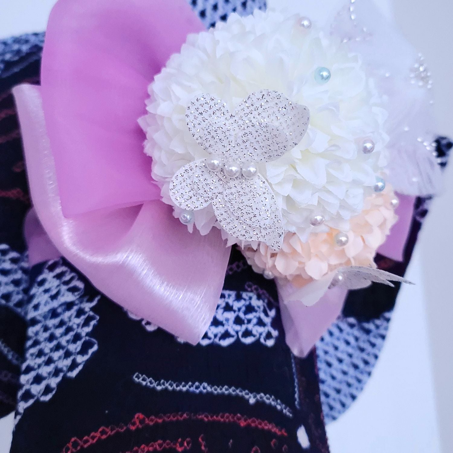 淡いピンクと紫のリボンが、蝶の羽ばたきを優しく彩ります。