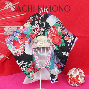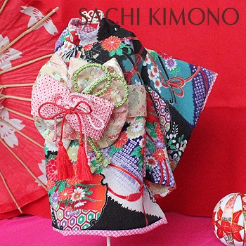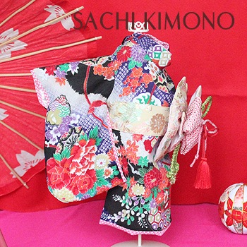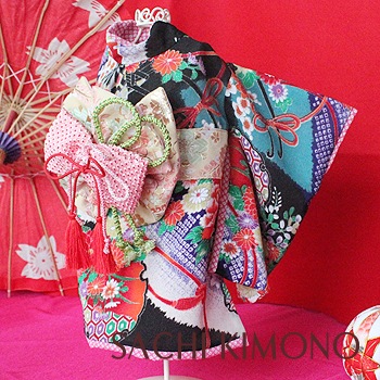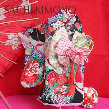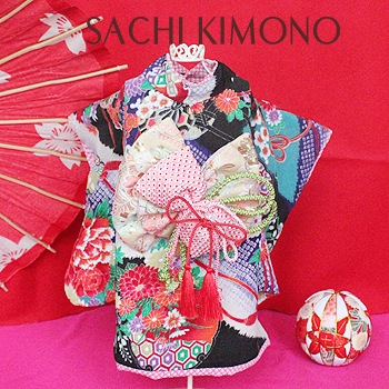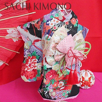 帯は縫い付け仕様。正絹の絞りリボン飾りで豪華さUP。
