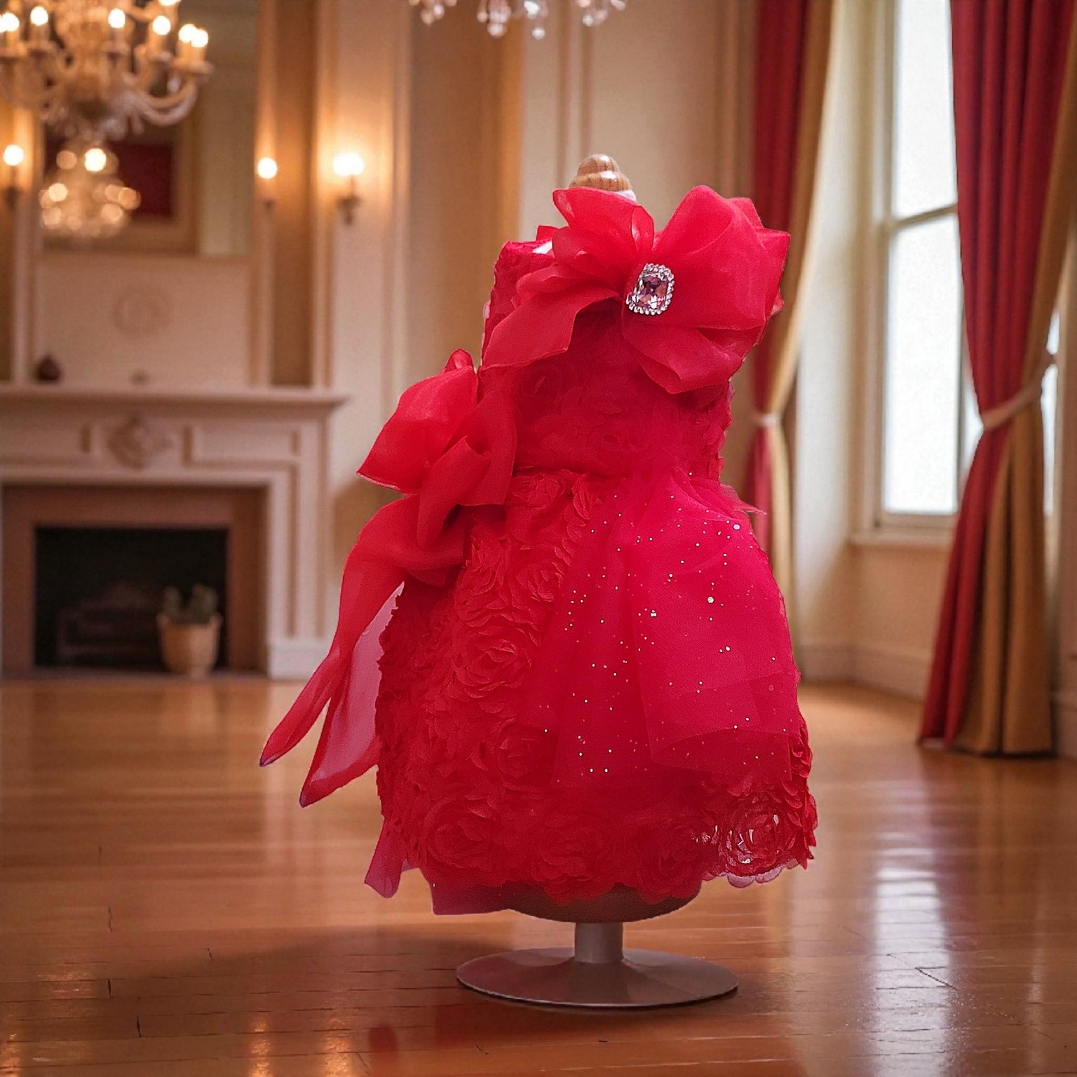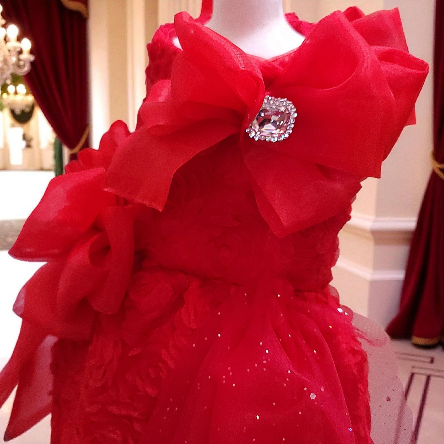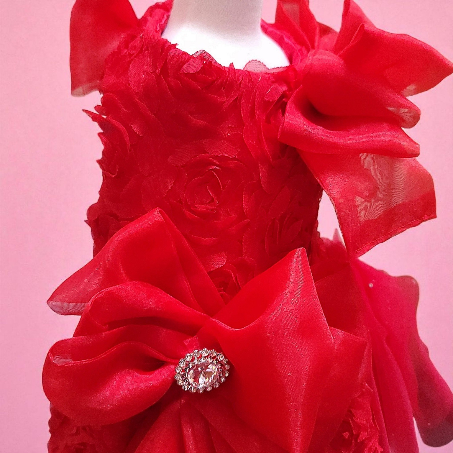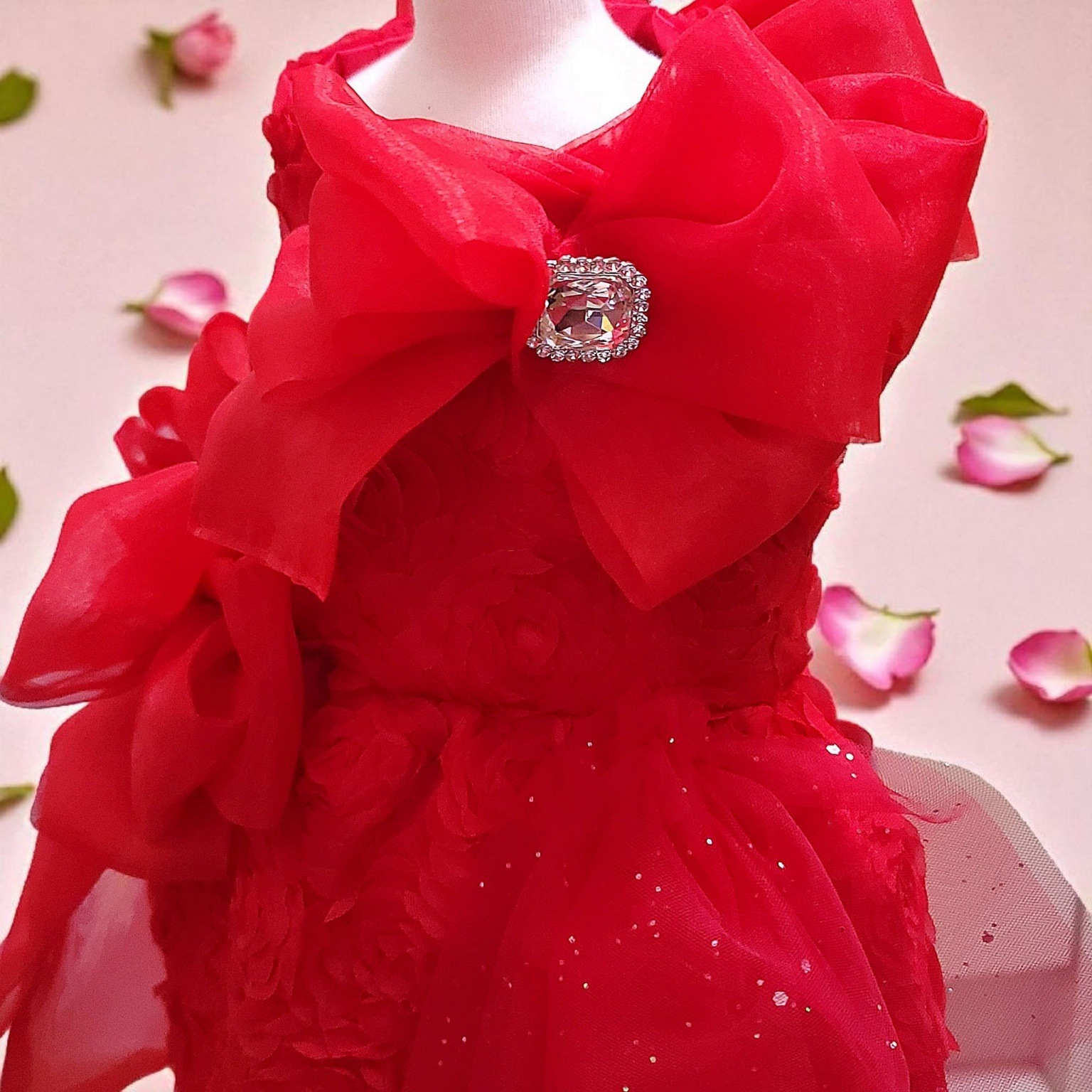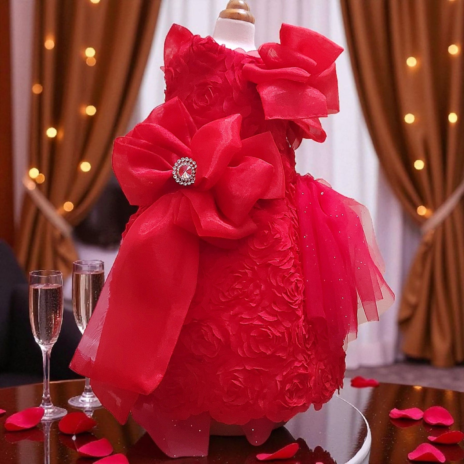 真紅の薔薇を一面に咲かせたドレスは、まるで“愛”そのものを形にしたよう。