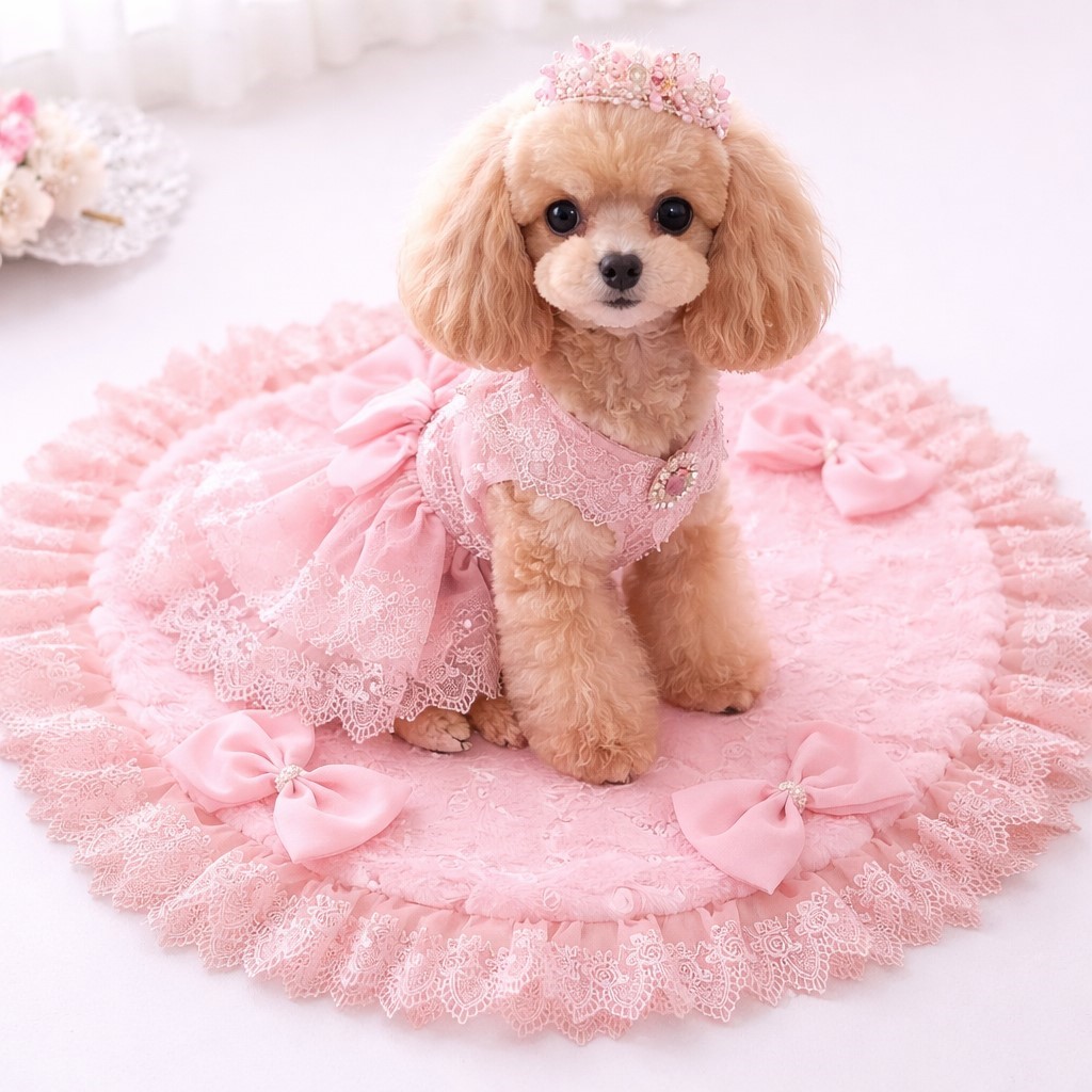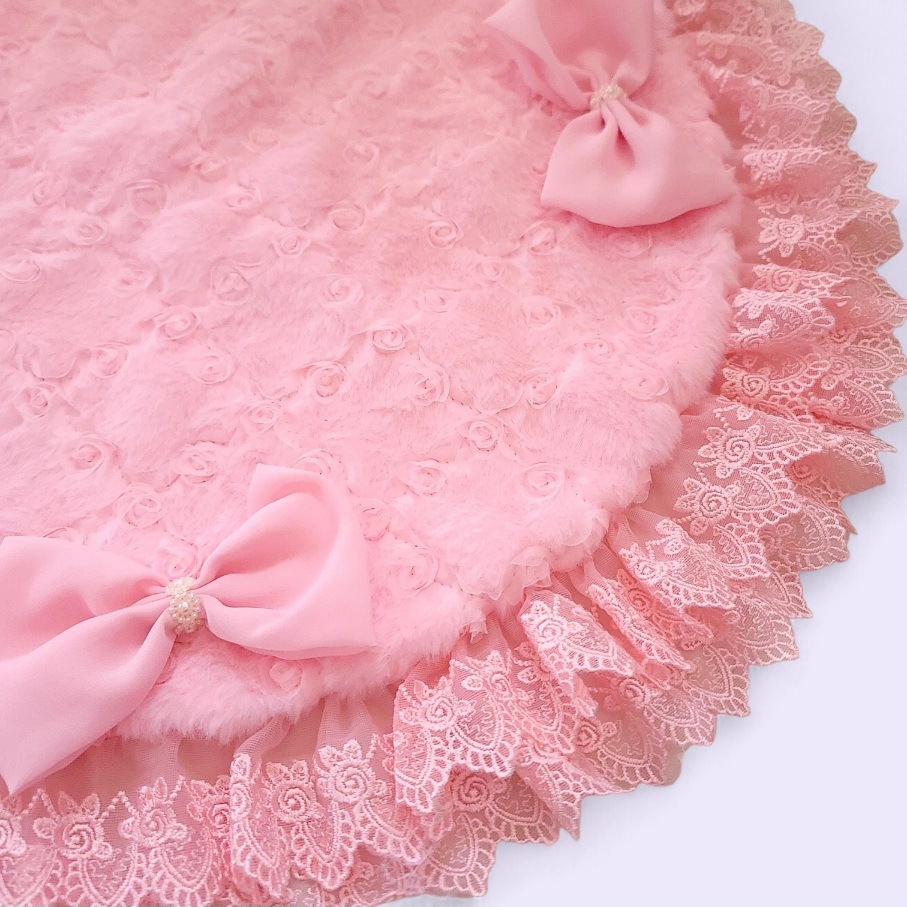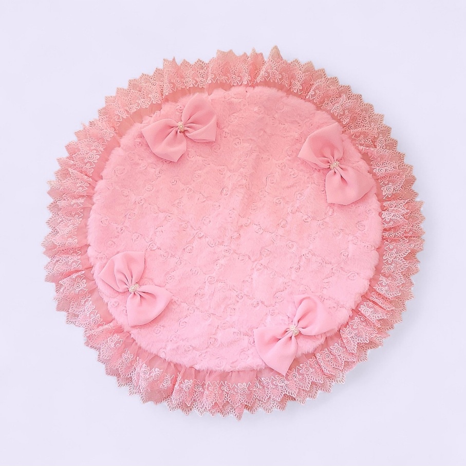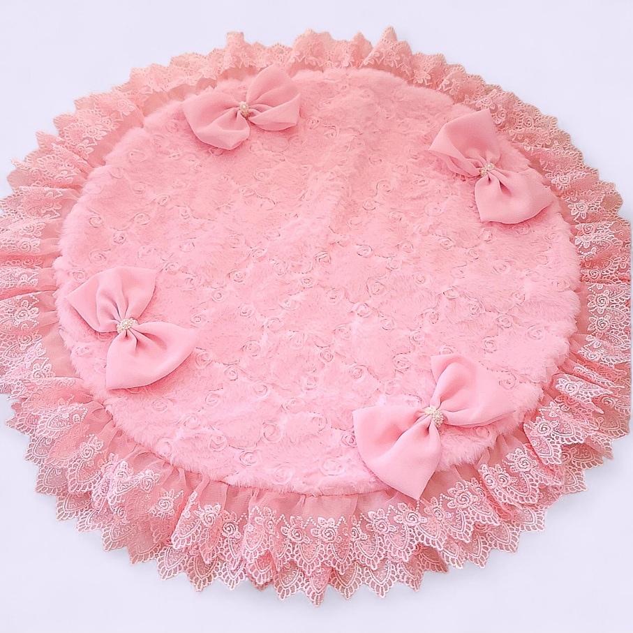 Rose Lace Cafe Mat(ローズレース カフェマット) やさしいローズピンクに、繊細なレースとリボンをあしらった SACHIらしい上質感あふれるカフェマット。 まるで花びらの上でくつろぐような、ふんわりとした肌触りは 大切なペットに「特別な居場所」をそっと用意してくれます。 直径60cm×60cmのゆとりあるサイズで、 カフェやレストランはもちろん、ご自宅での撮影やくつろぎ時間にも最適。 空間に置くだけで、日常が少し華やぐ。 それは、SACHIが大切にしている“幸せを包むものづくり”そのものです。 サイズ:60cm × 60cm