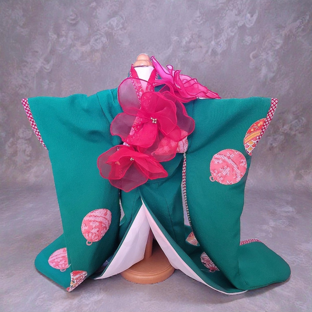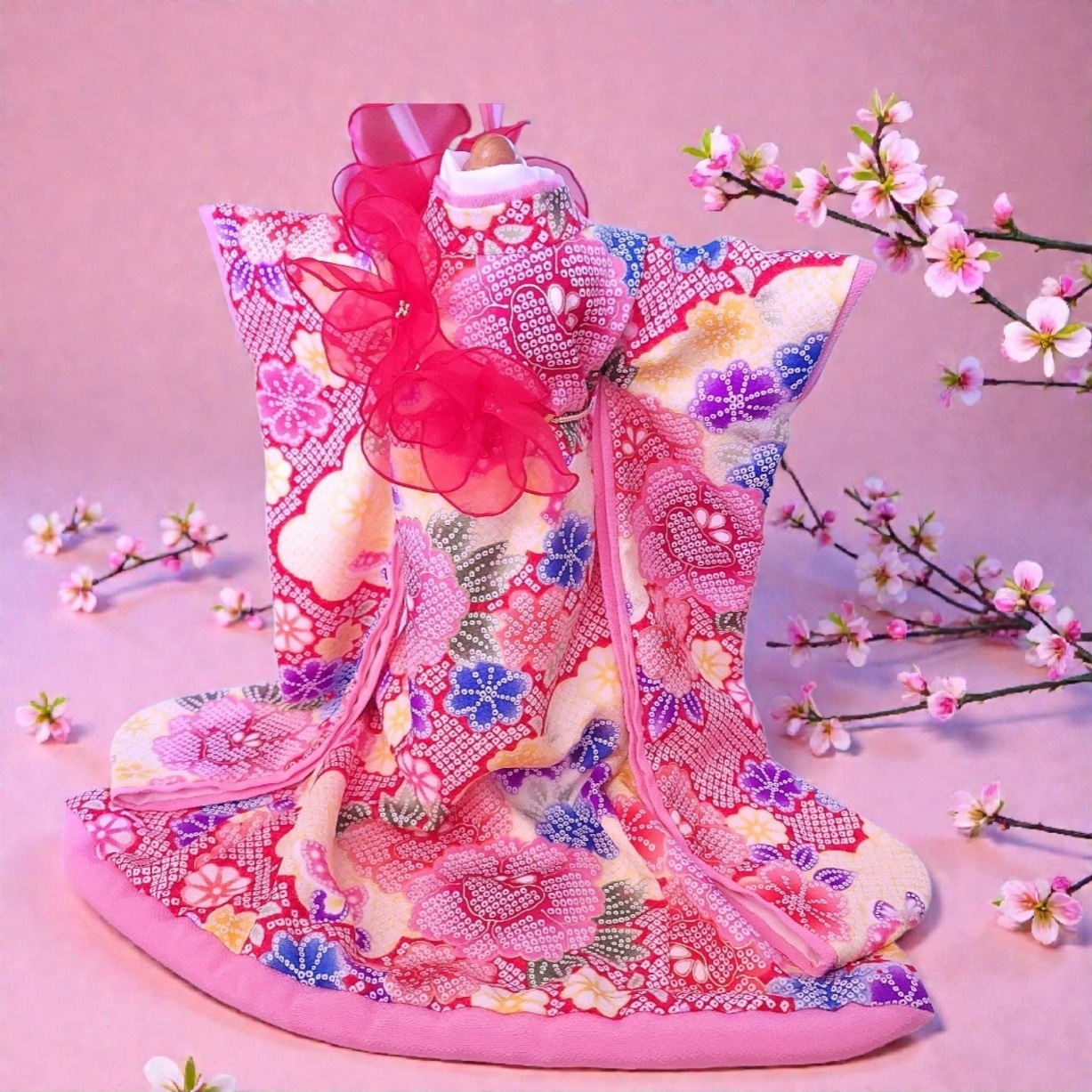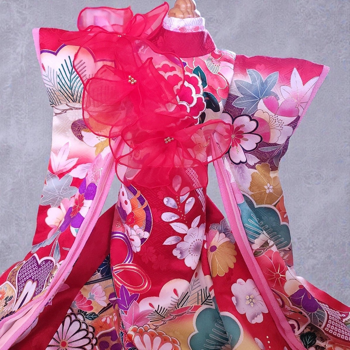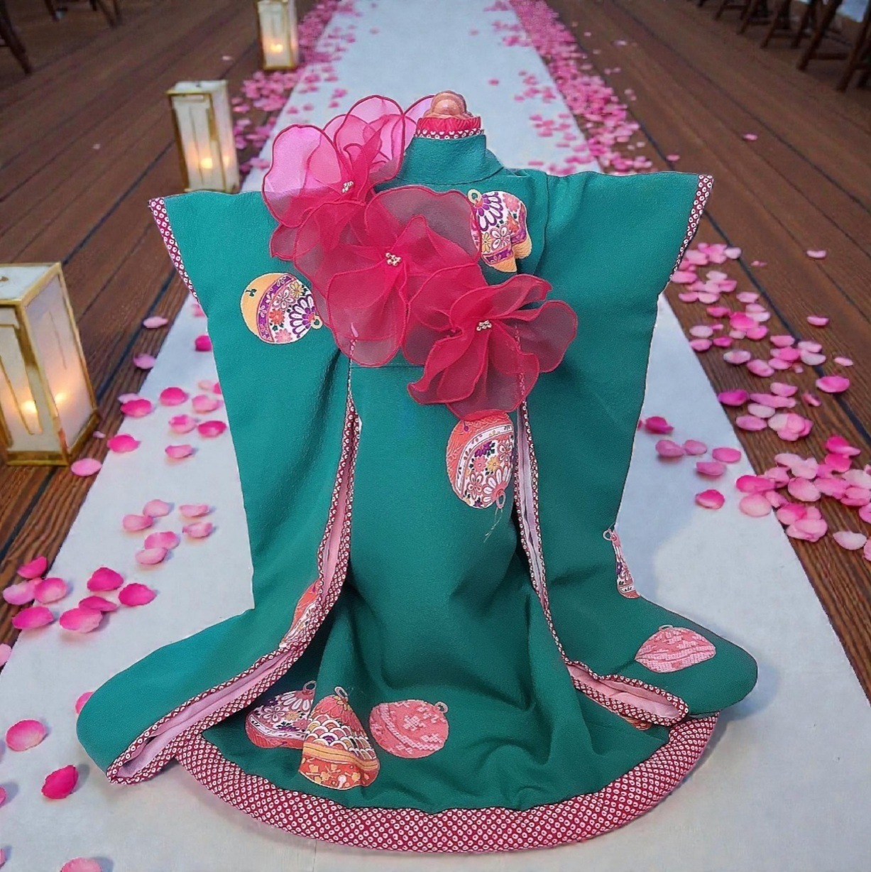 肩から胸元にかけて流れる立体的な花飾りが、伝統的な着物スタイルをやわらかくロマンティックに演出します。
