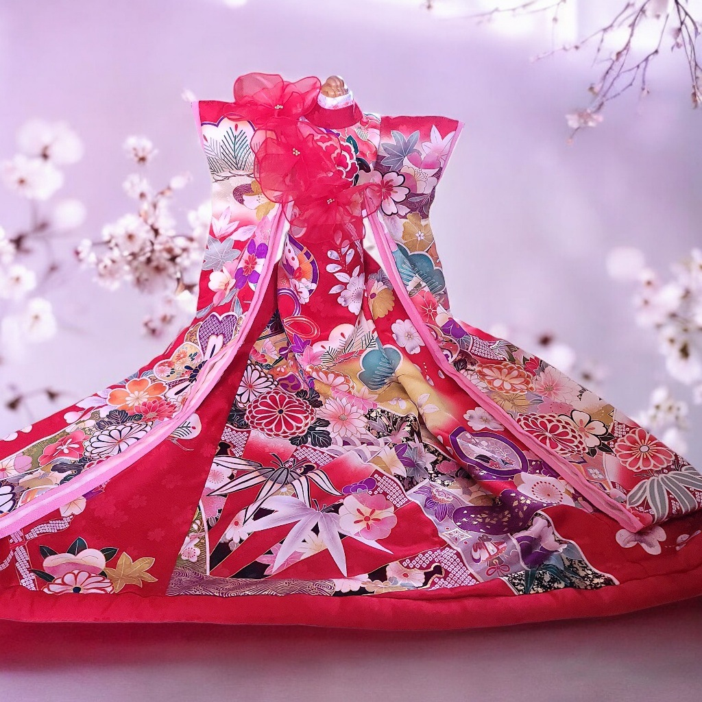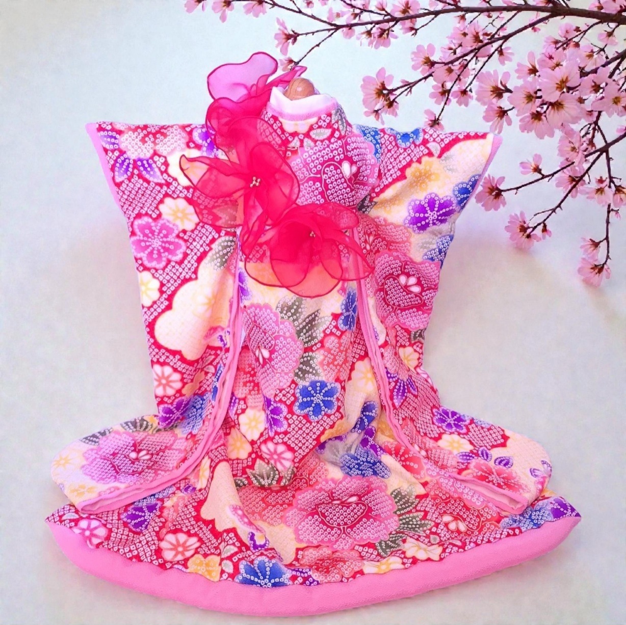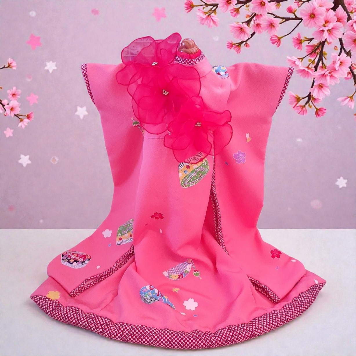 肩から胸元にかけて流れる立体的な花飾りが、伝統的な着物スタイルをやわらかくロマンティックに演出します。
