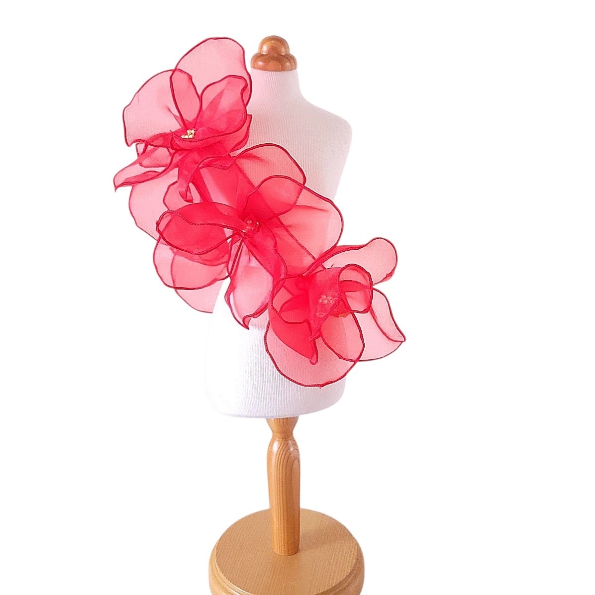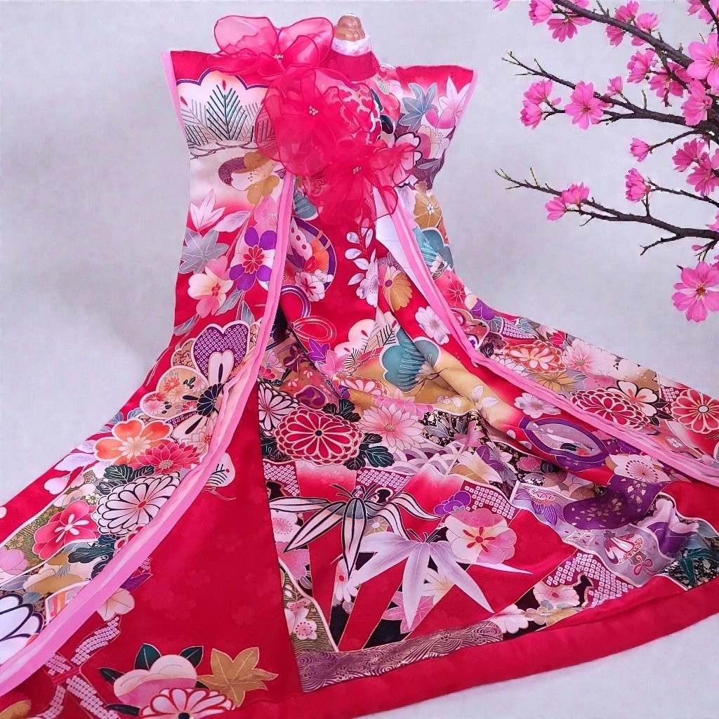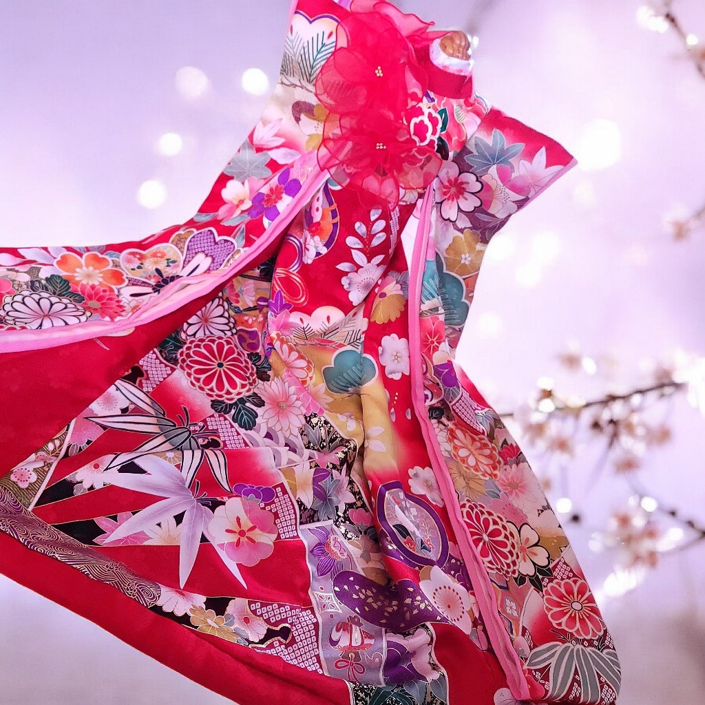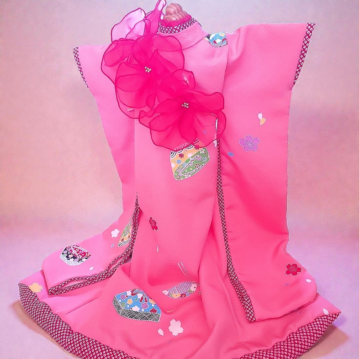 肩から胸元にかけて流れる立体的な花飾りが、伝統的な着物スタイルをやわらかくロマンティックに演出します。