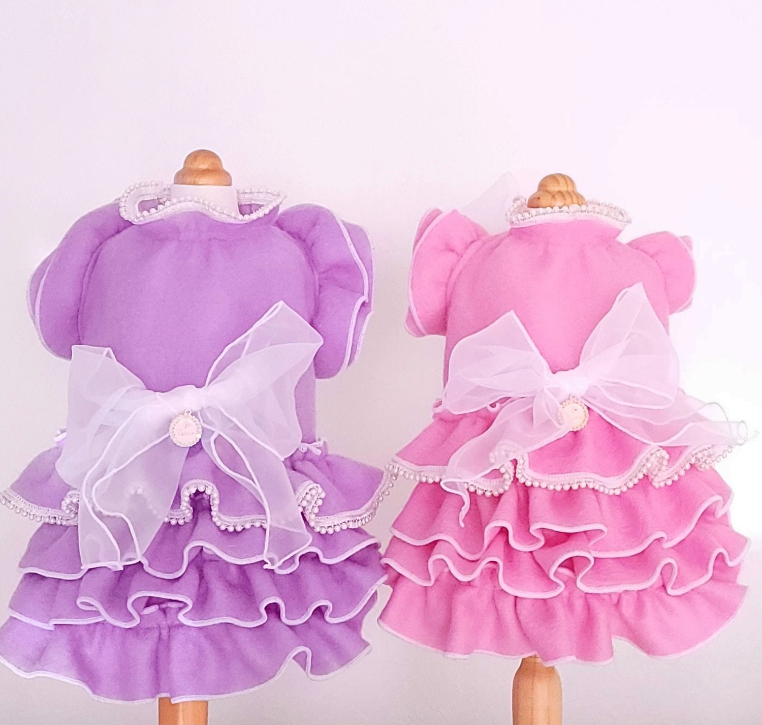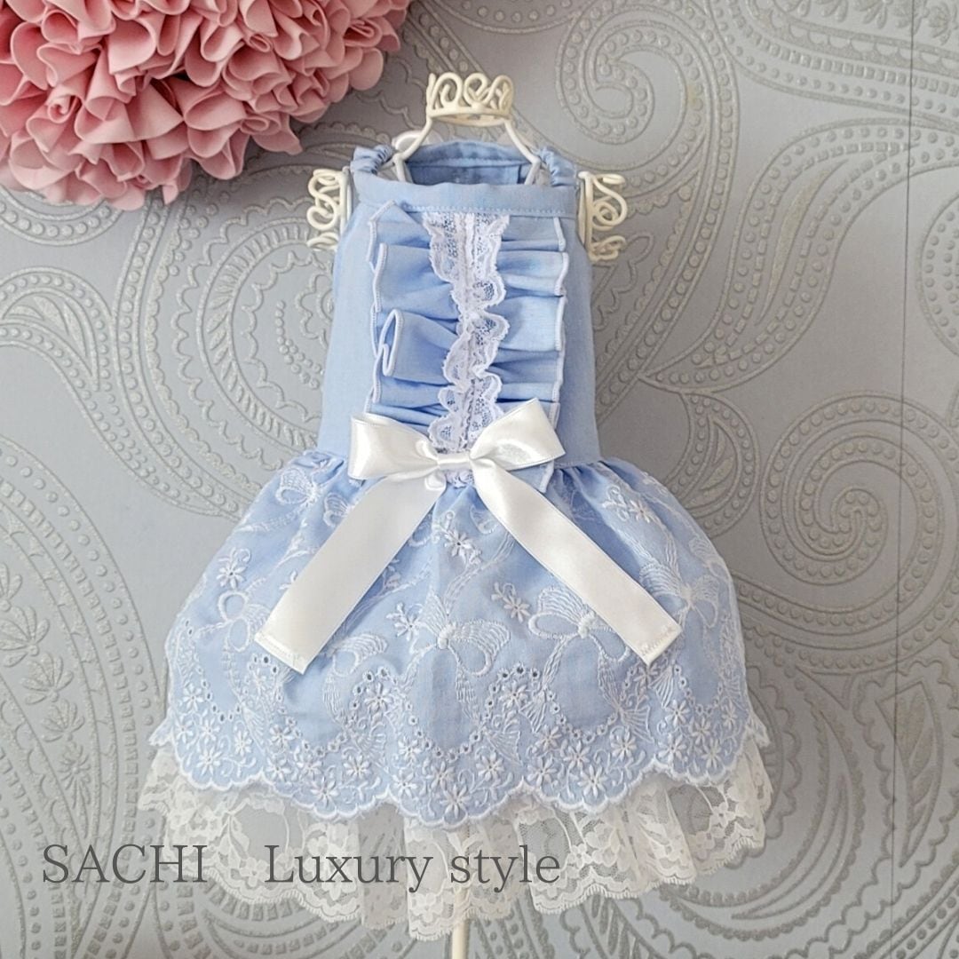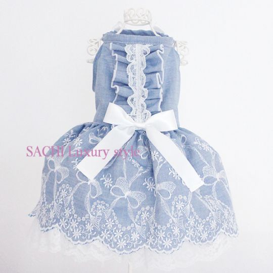 ペット服のデニムリボン刺繍ドレスライトブルー ペットのワンピース犬のワンピース