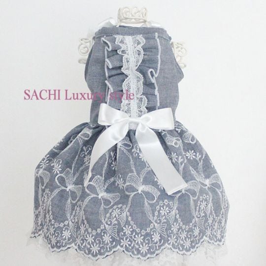 ペット服のデニムリボン刺繍ドレスブルー ペットのワンピース犬のワンピース