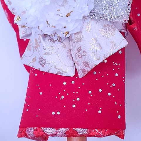 帯に飾られた白牡丹は、純白の雪に映える花々をイメージし、金の装飾が晴れやかな雰囲気を添えます。