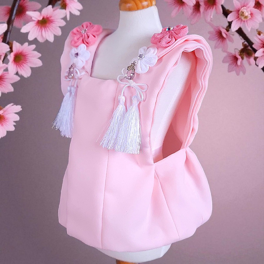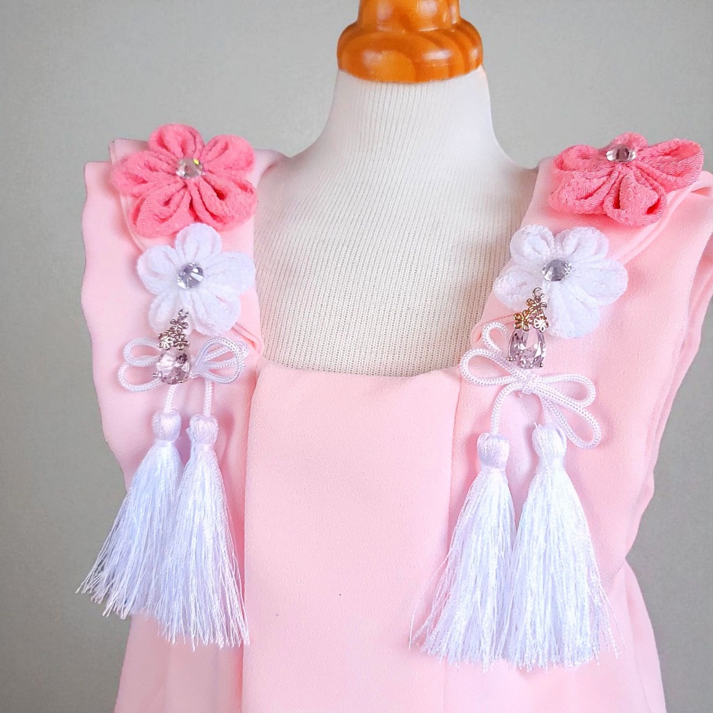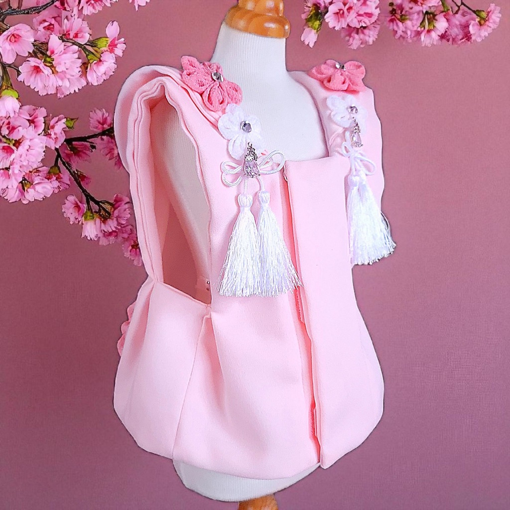桜の花飾りと、やさしいピンクの房飾り、煌めくジルコニアをあしらった被布コート「花梨」。
