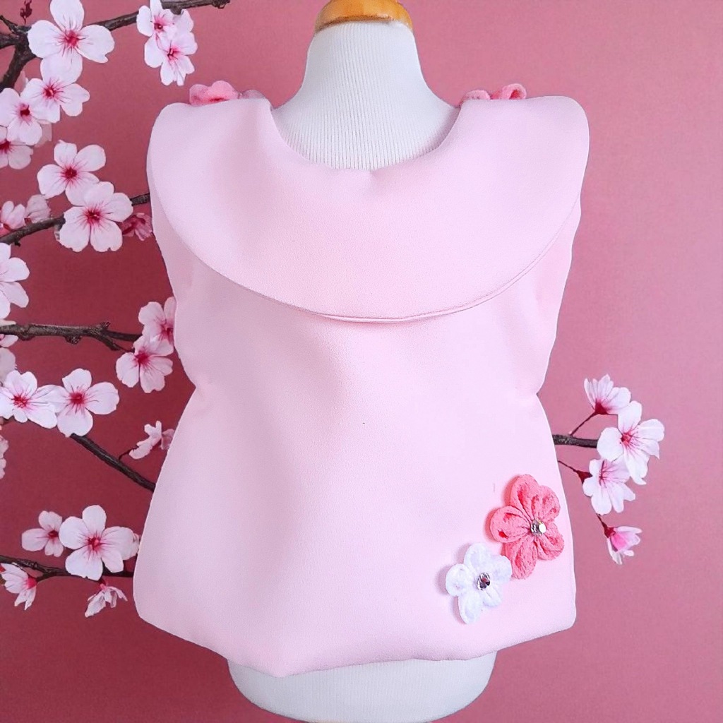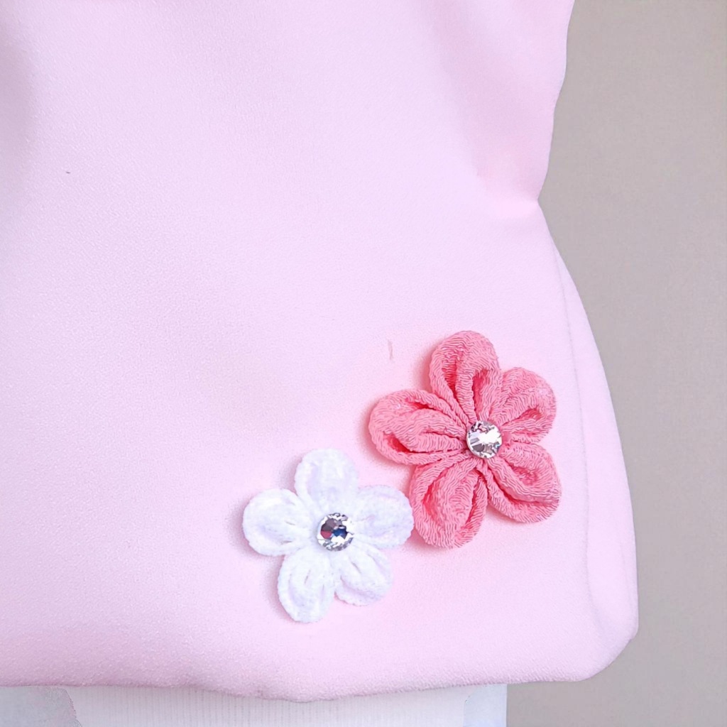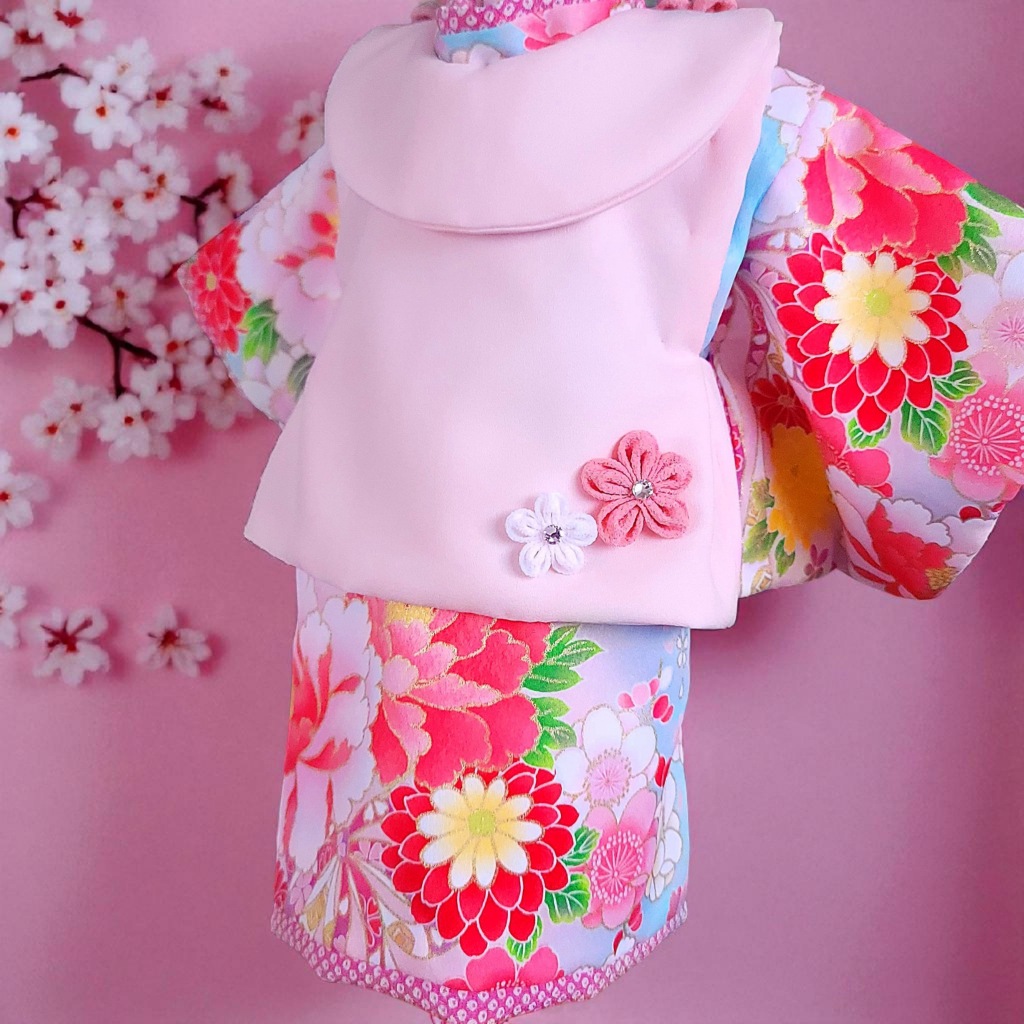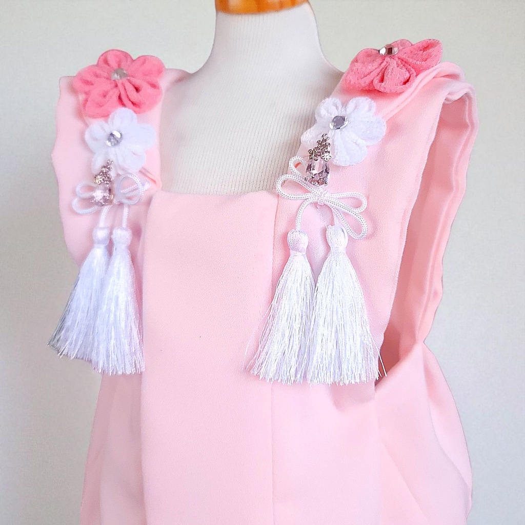 桜の花飾りと、やさしいピンクの房飾り、煌めくジルコニアをあしらった被布コート「花梨」。