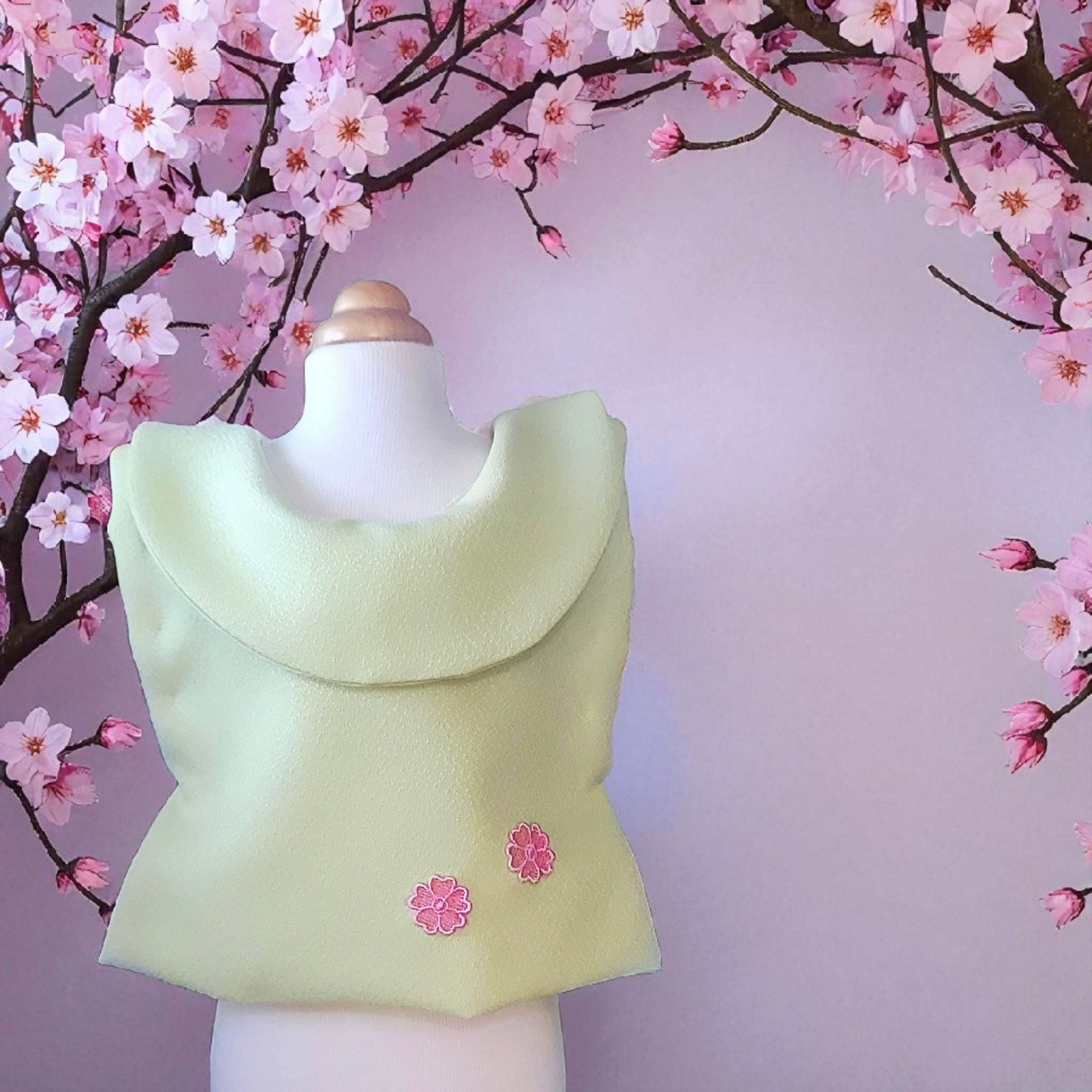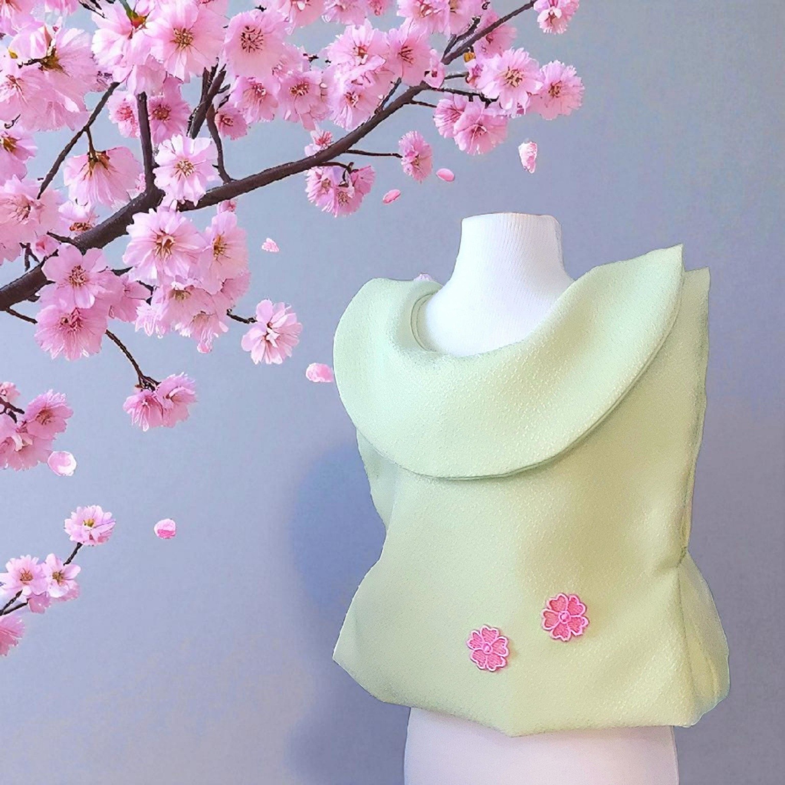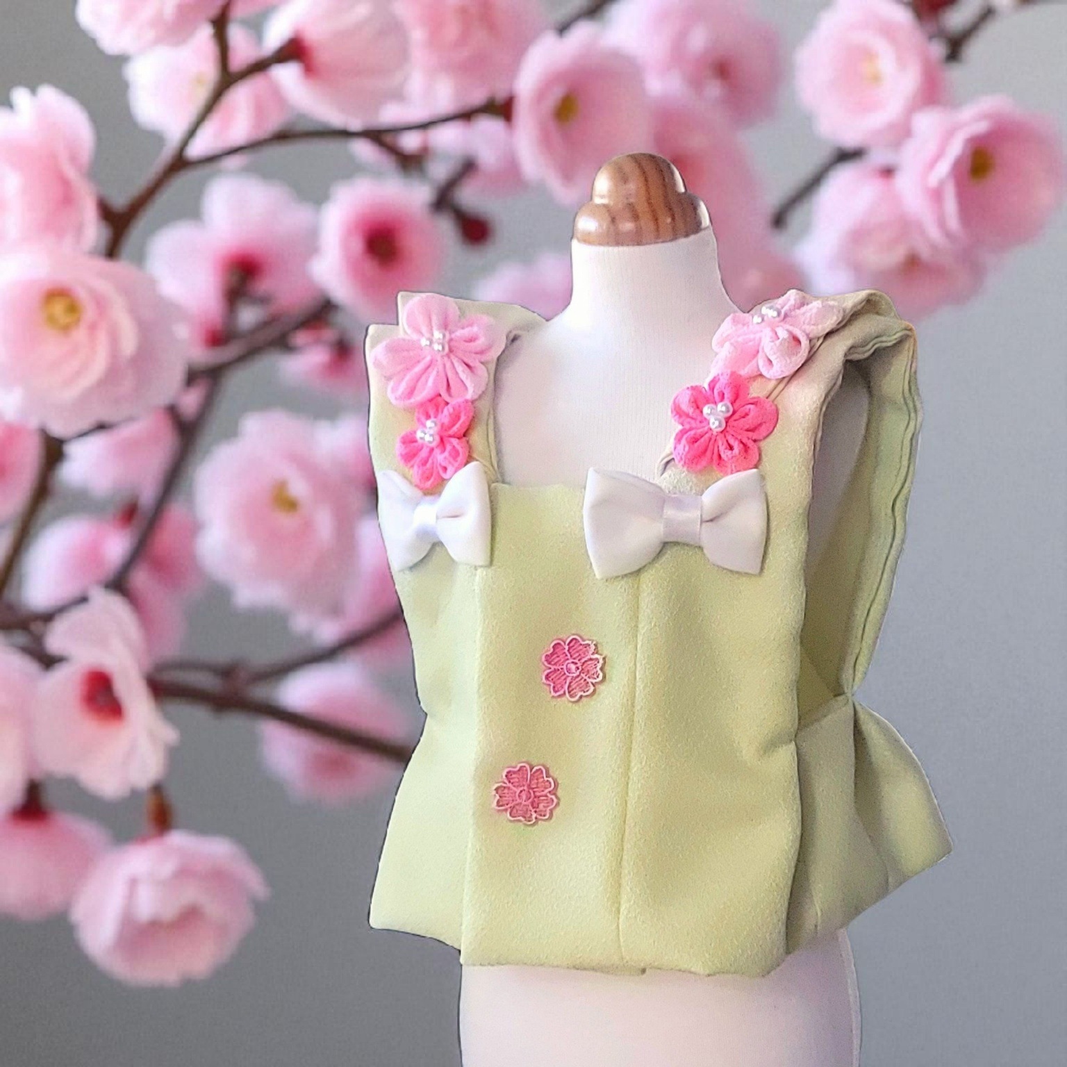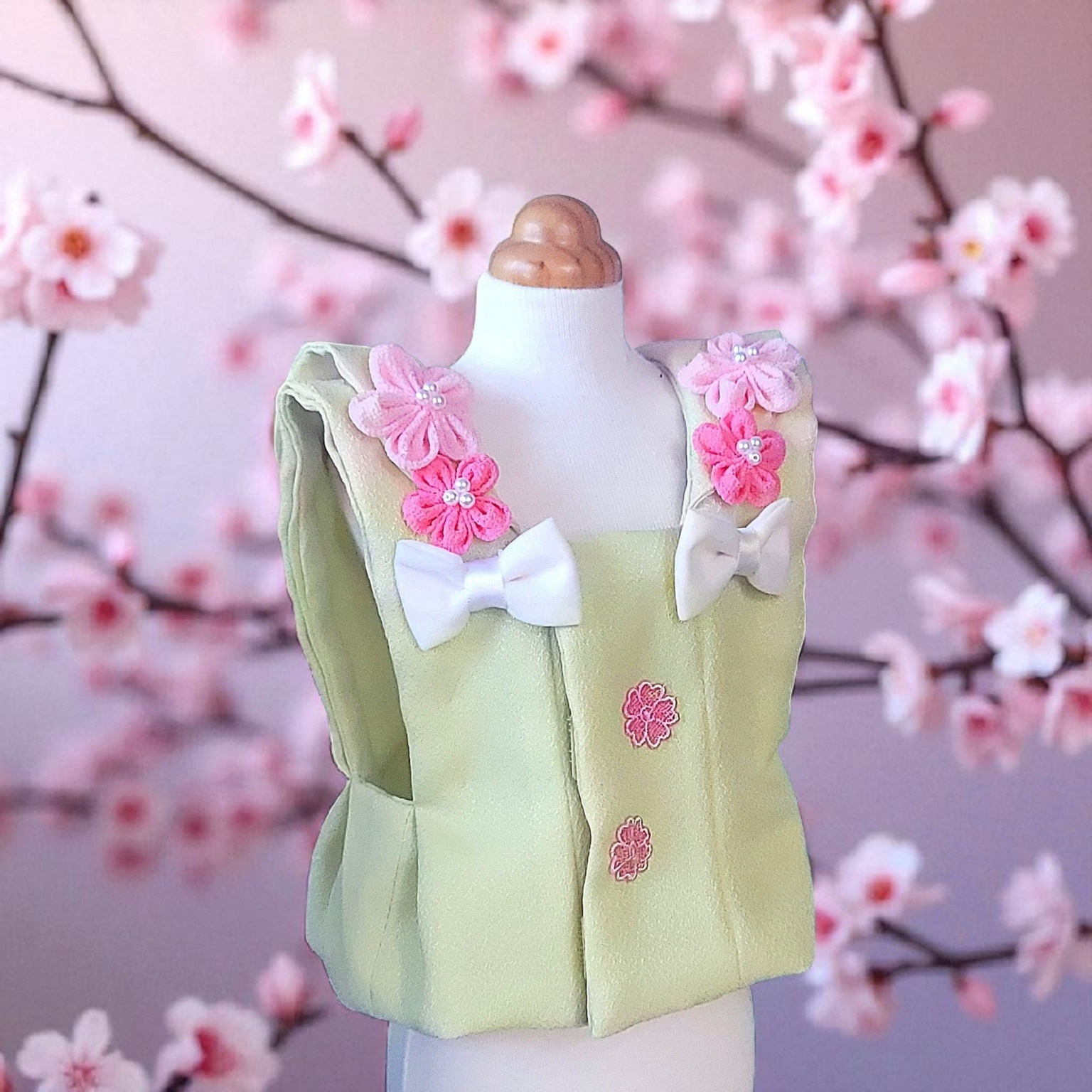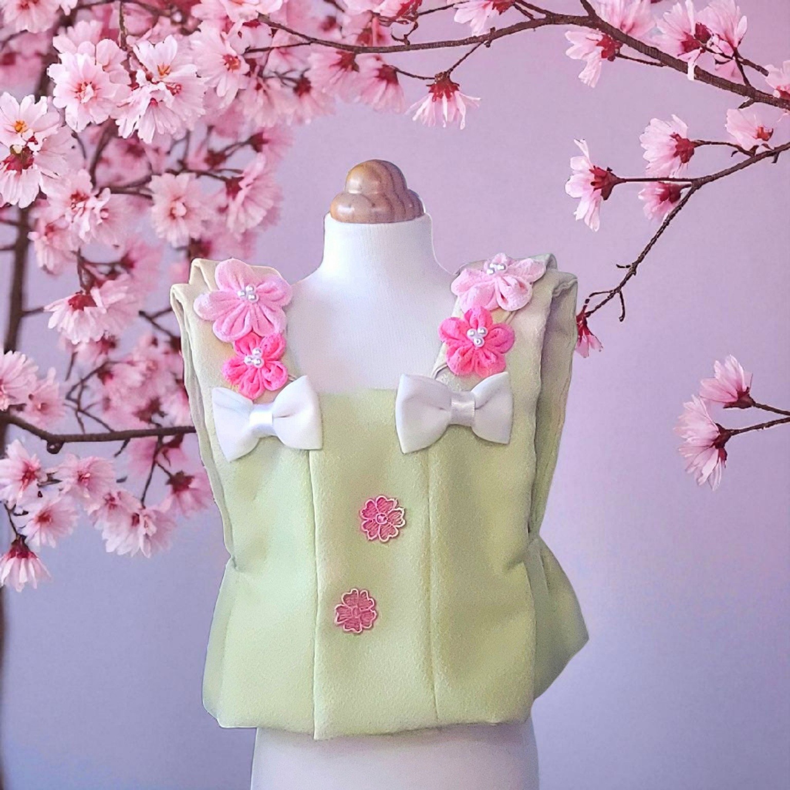 桜の花飾りと、ベルベットリボンをあしらった被布コート「花梨」。