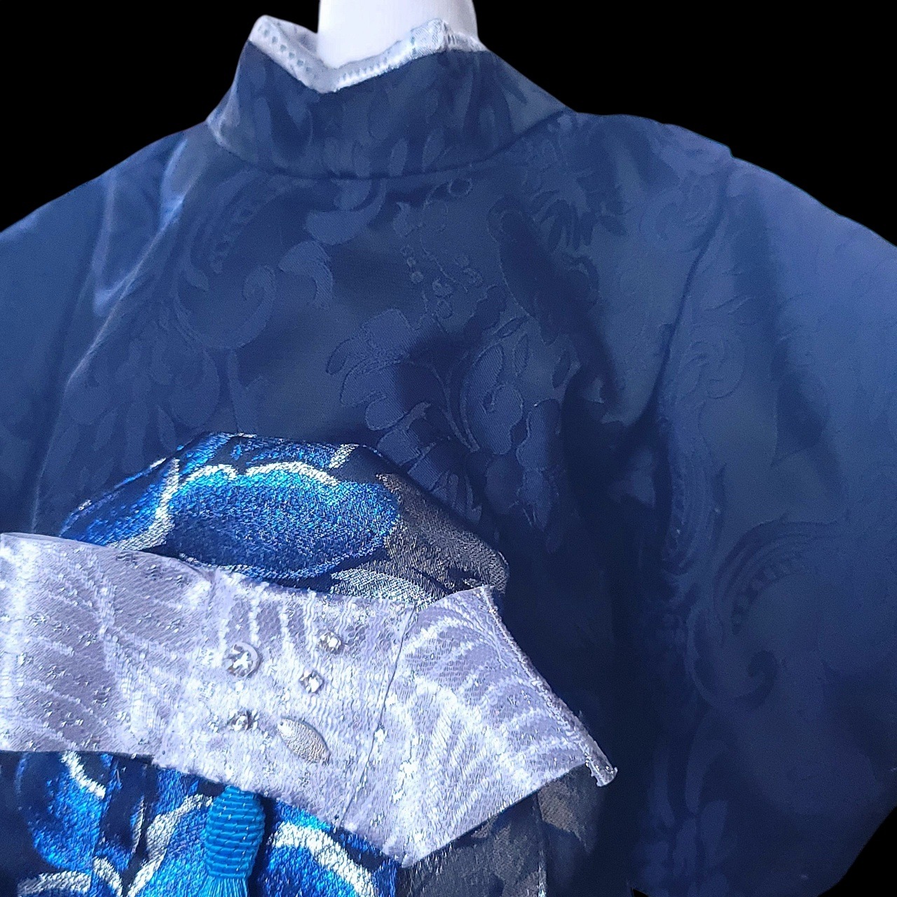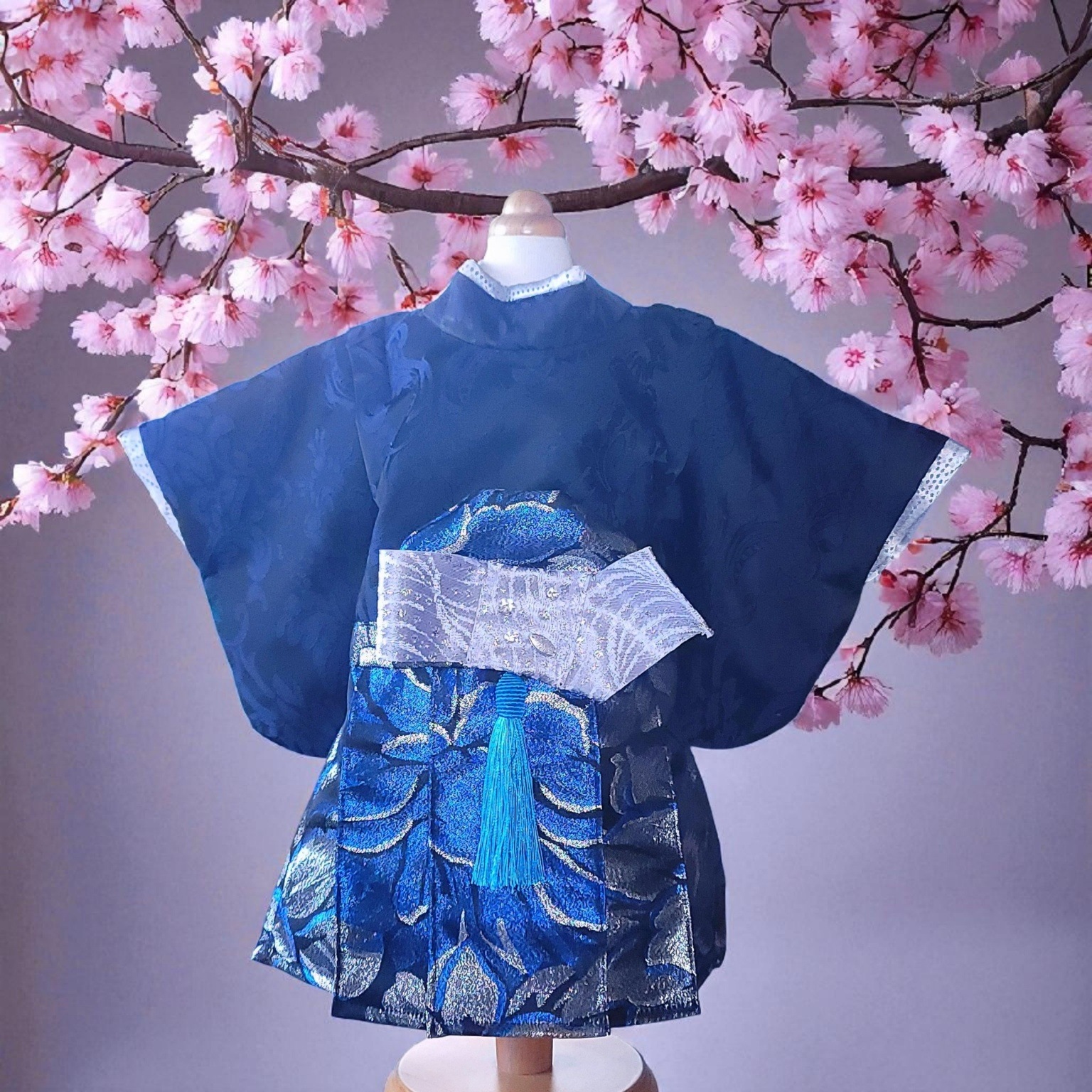 深みのある紺地に咲く牡丹を、青と銀糸で繊細に織り上げた高級感あふれる一着「蒼雅」。