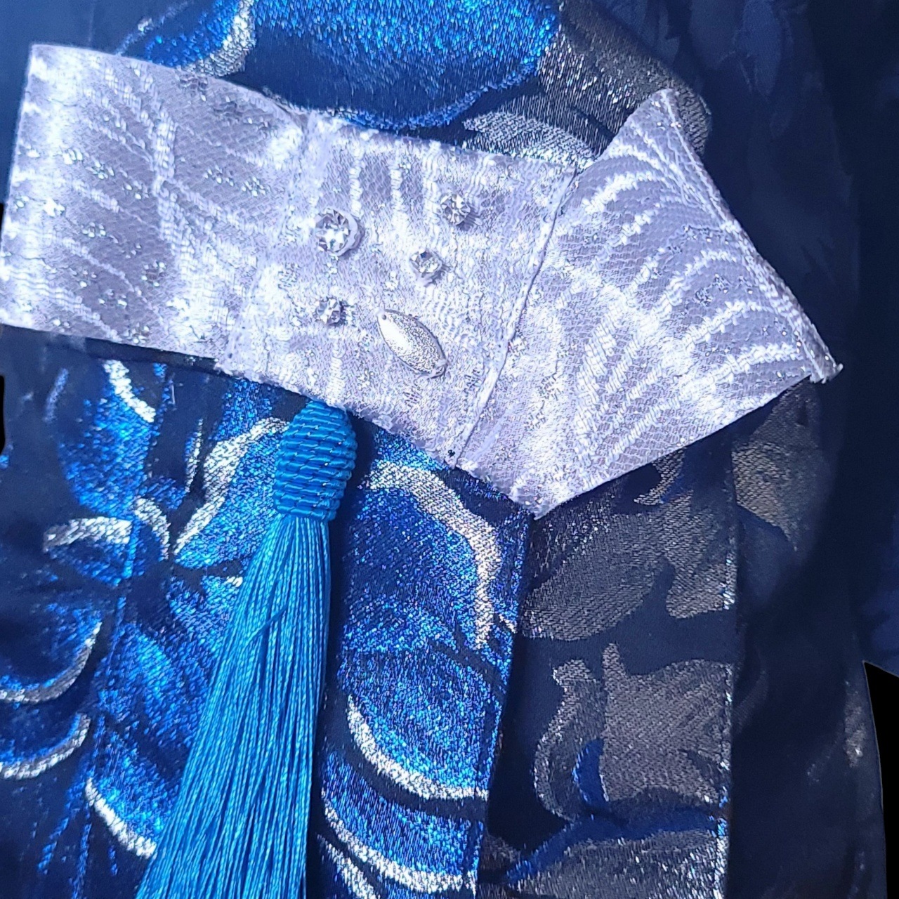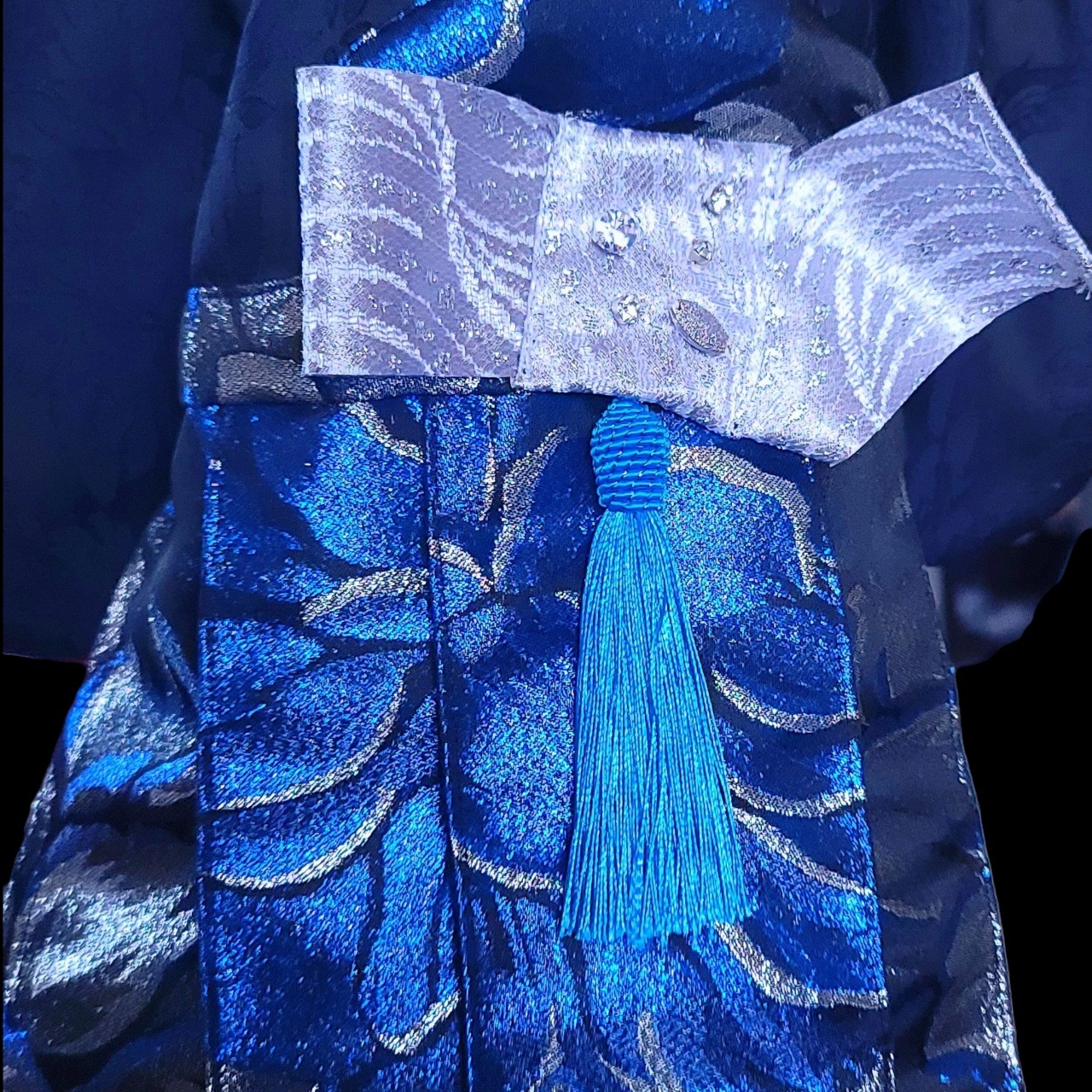 袴のアクセントとしてクリスタルの袴飾りがあしらわれており、光を受けるたびにその輝きが一層際立ちます