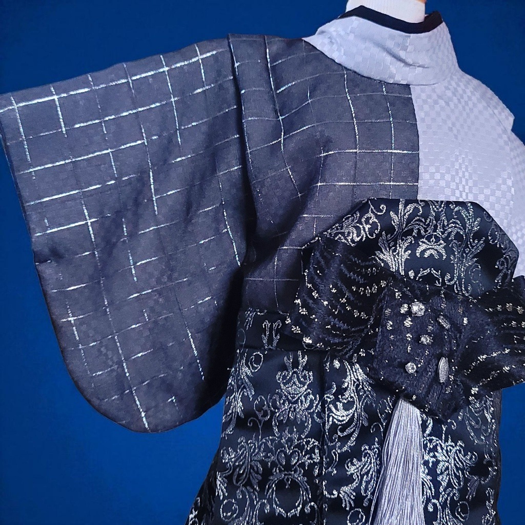 繊細な文様を施した帯は、漆黒の煌めきと白銀のタッセルでアクセントを加え、洗練された印象を演出します。