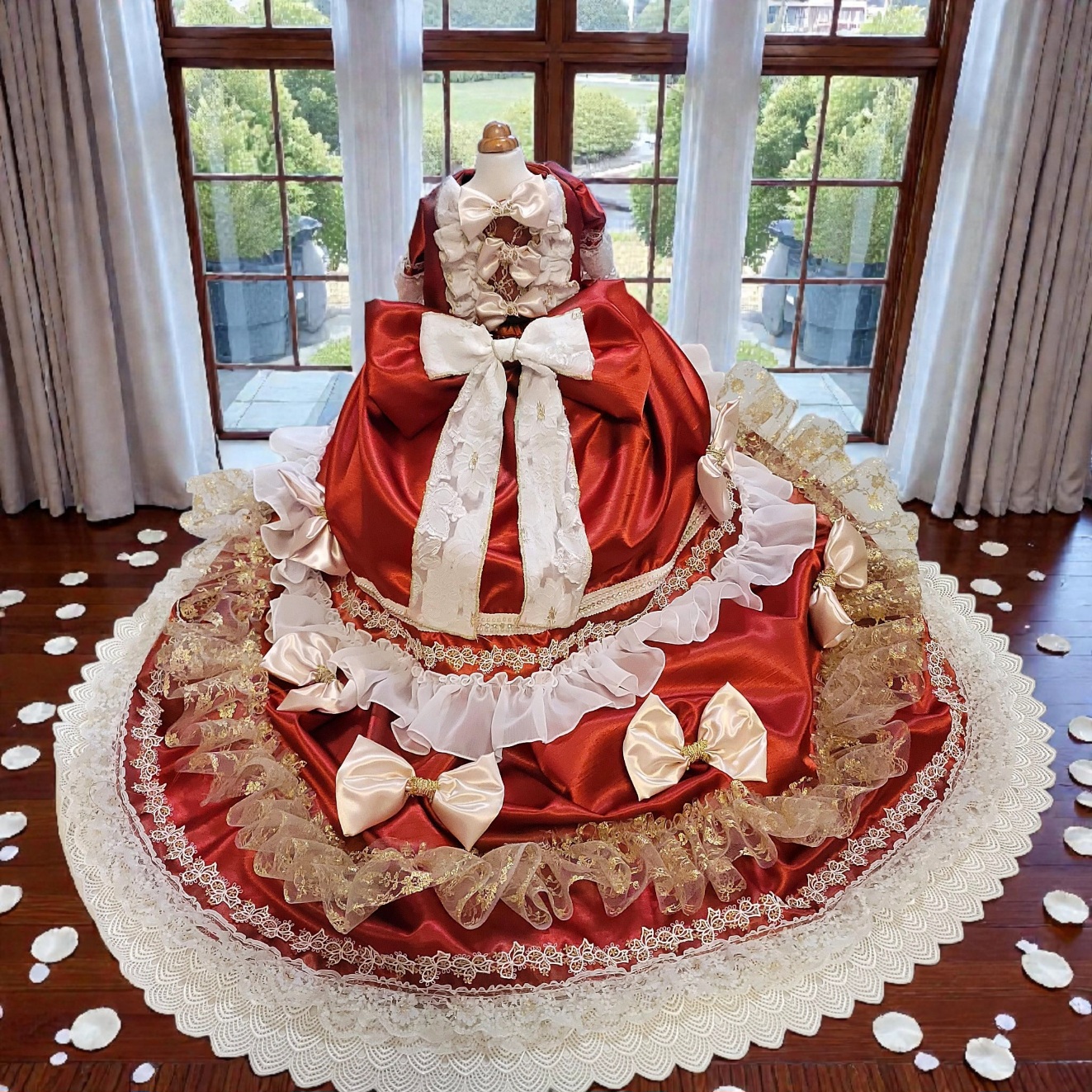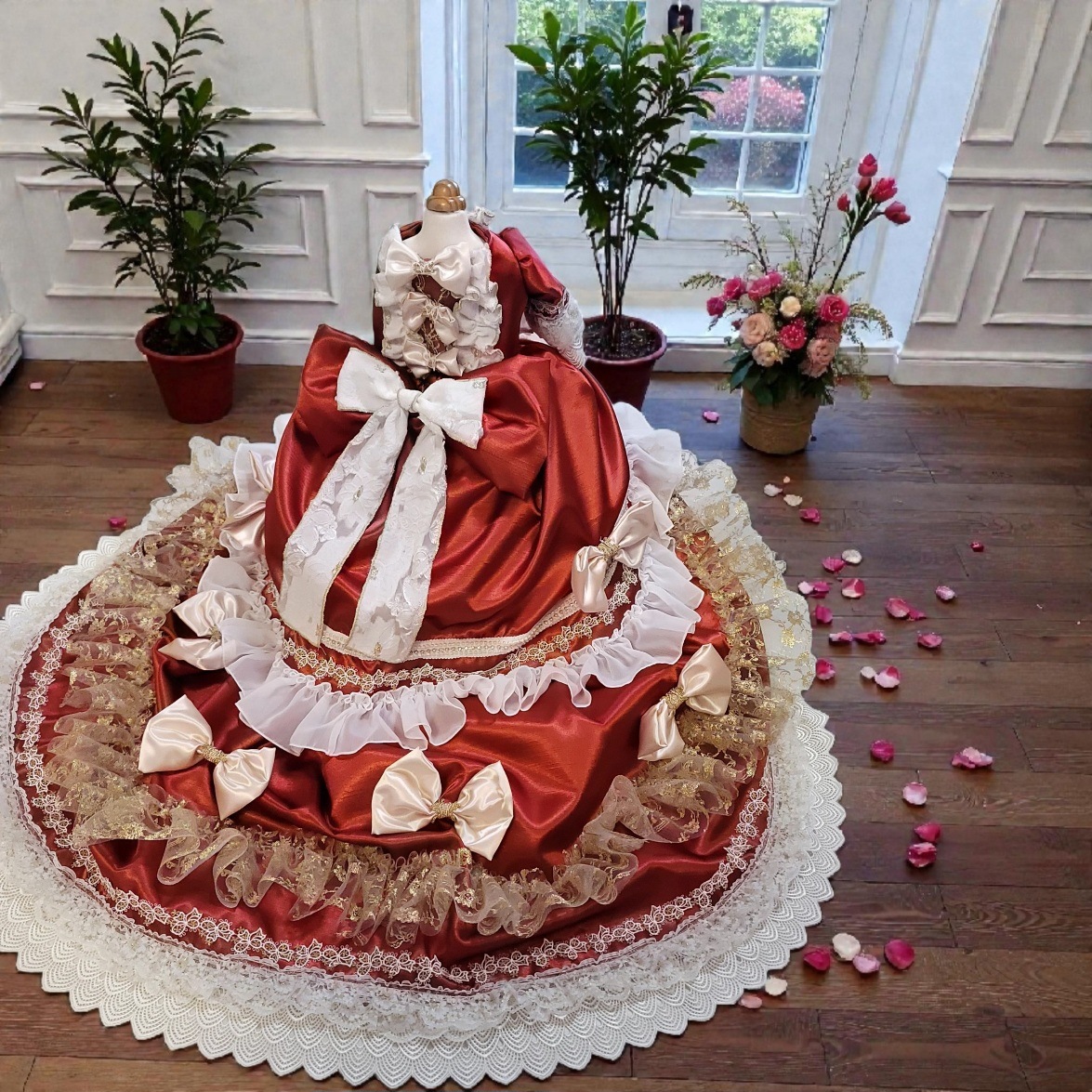 贅沢に広がる円形トレーンには、ゴールドレースとフリルを幾重にも重ね、格式ある宮廷スタイルを完成させました。