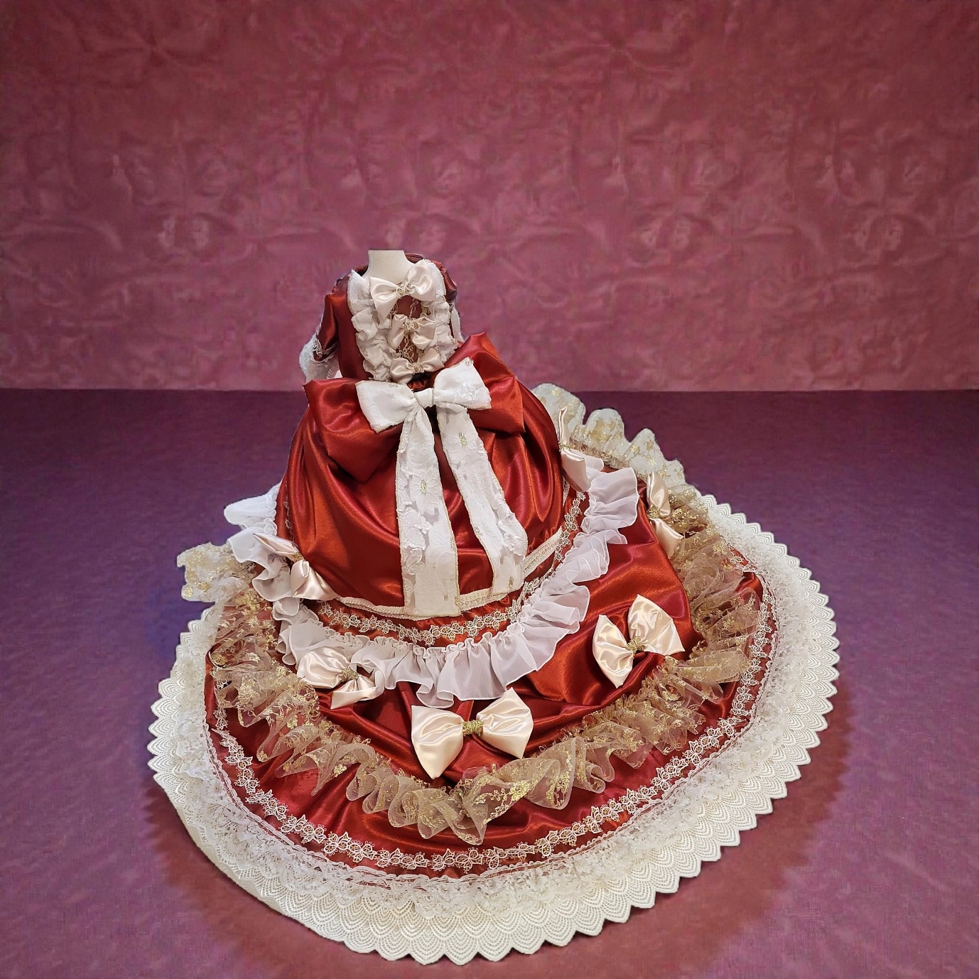 深いルビーレッドの上質サテンが放つ艶やかな光沢は、気品と存在感を際立たせます。