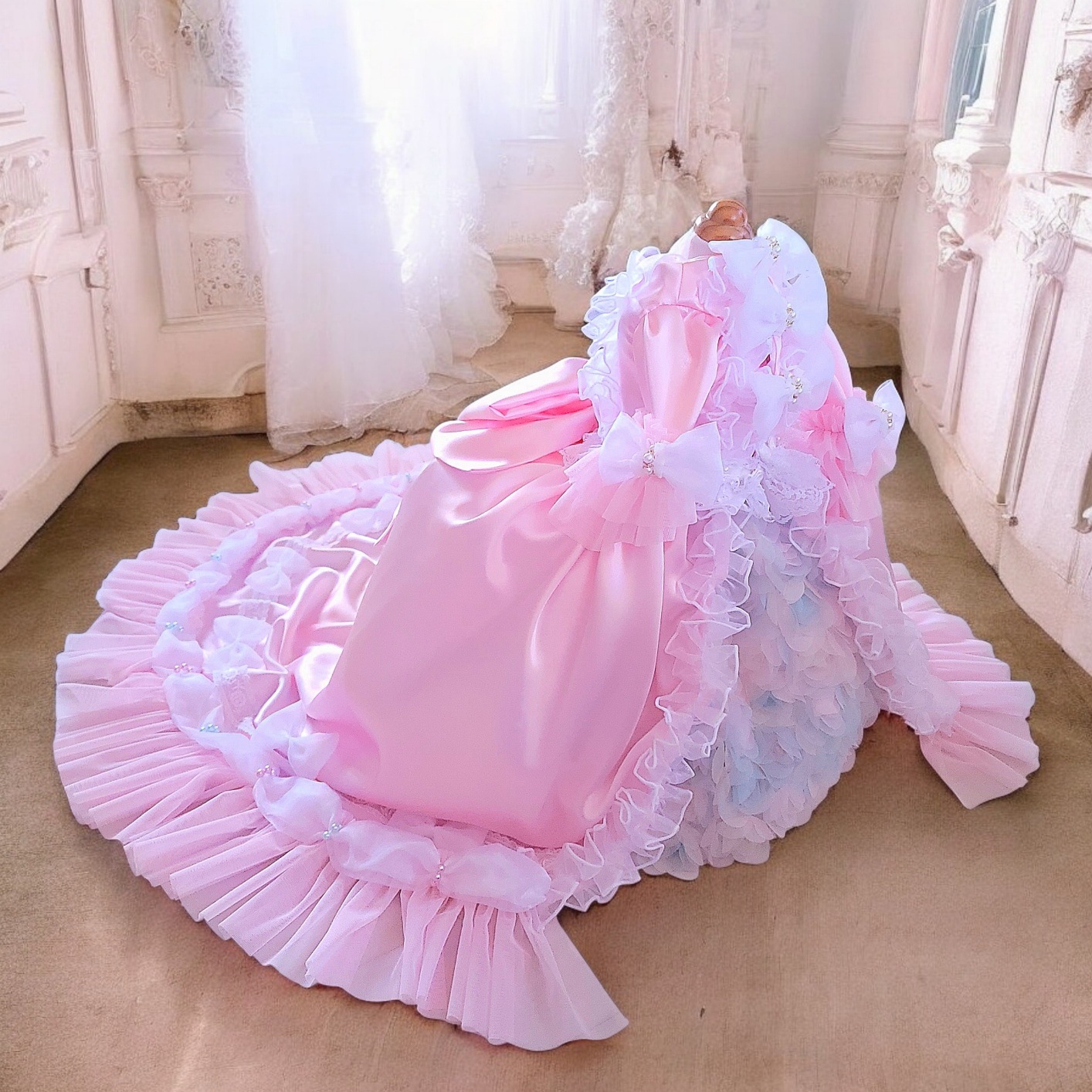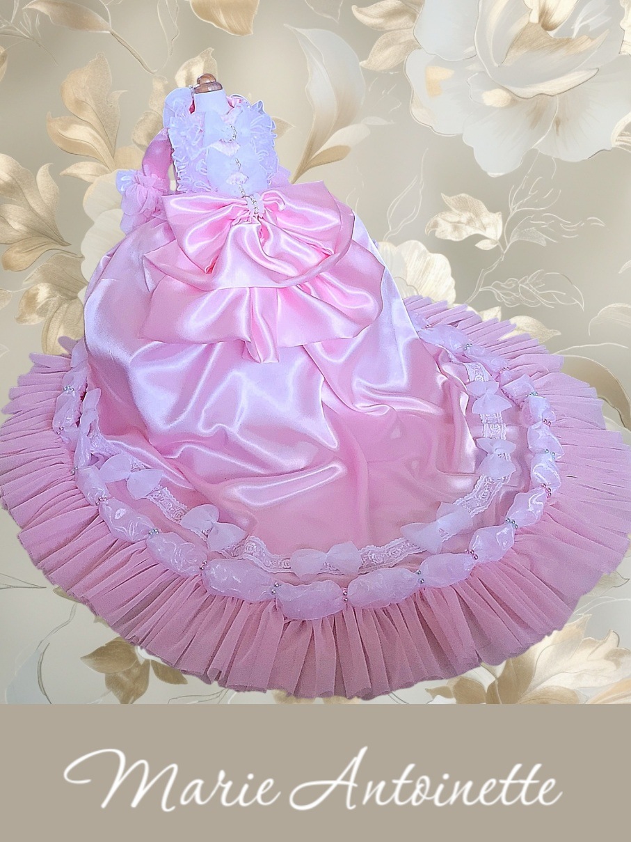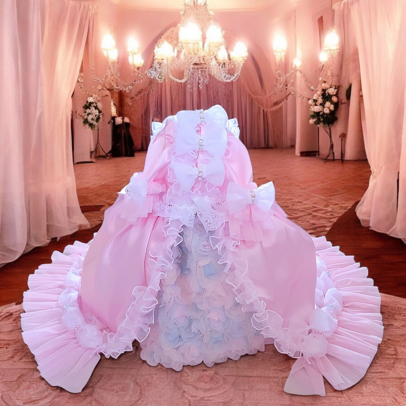 やわらかな祝福の光に包まれる、ベビーピンクの宮廷プリンセスドレス。