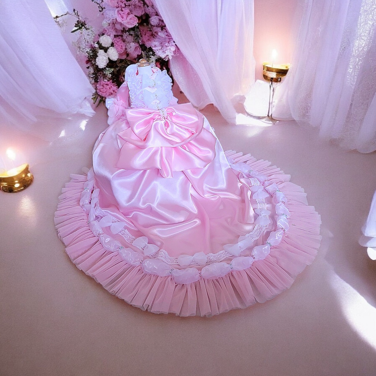 裾には花びらのように連なる装飾と繊細なレースを重ね、まるで物語のワンシーンのような優雅なシルエットを演出します。